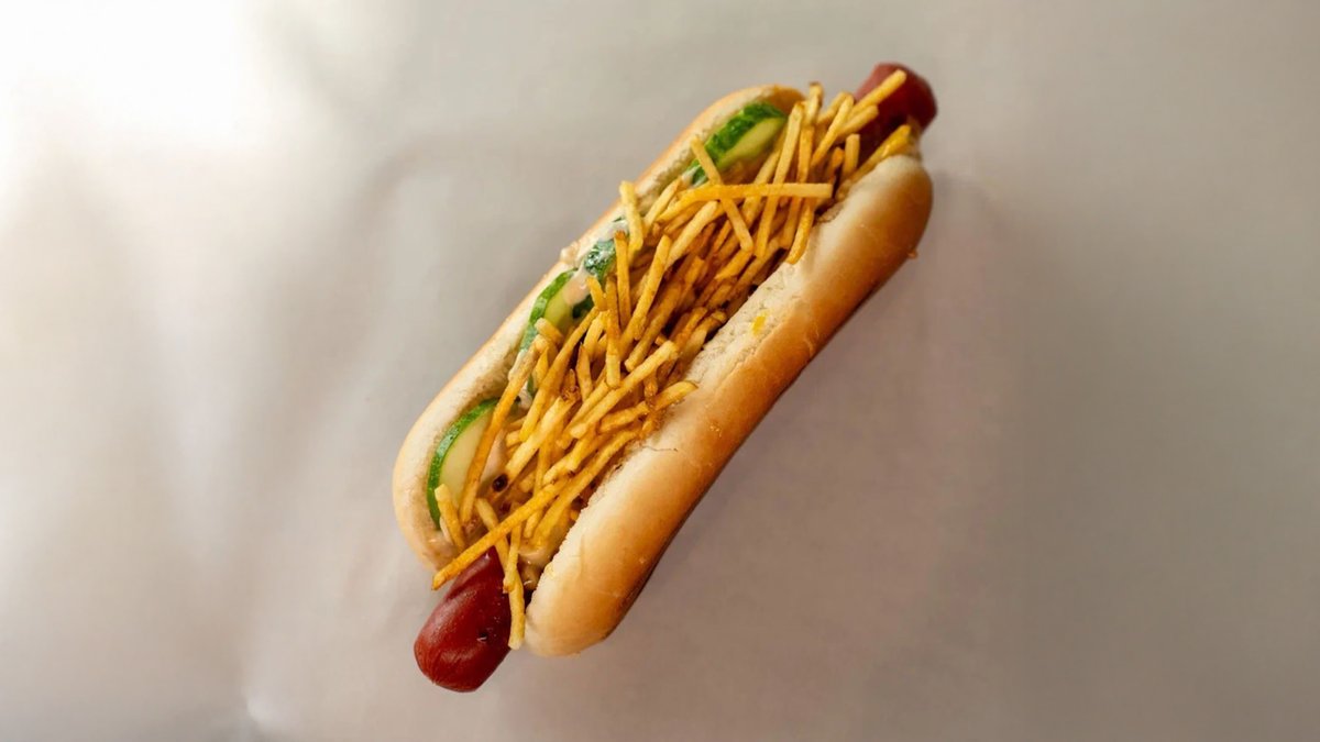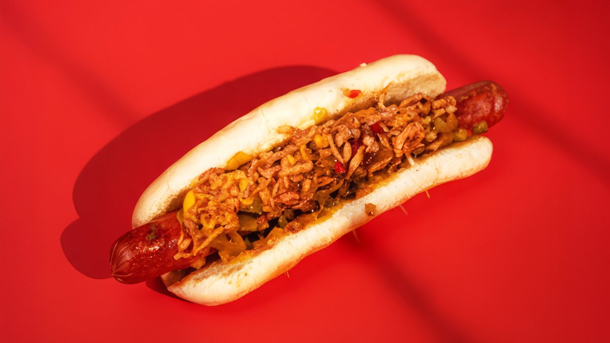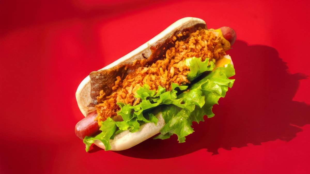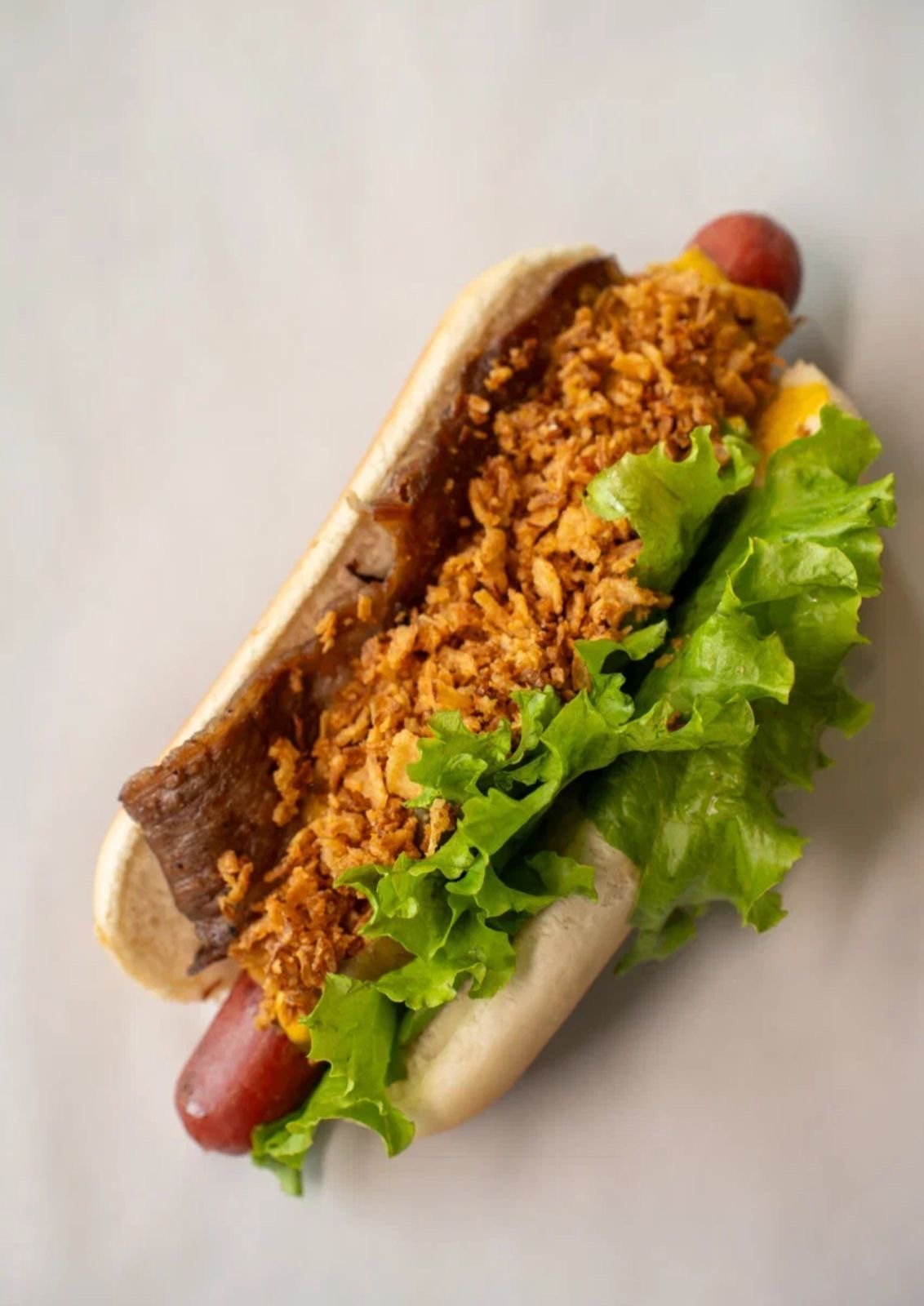 Булочка датская, сосиска говяжья, карамельный лук фри, кетчуп, фирменный соус релиш, соус горчичный.