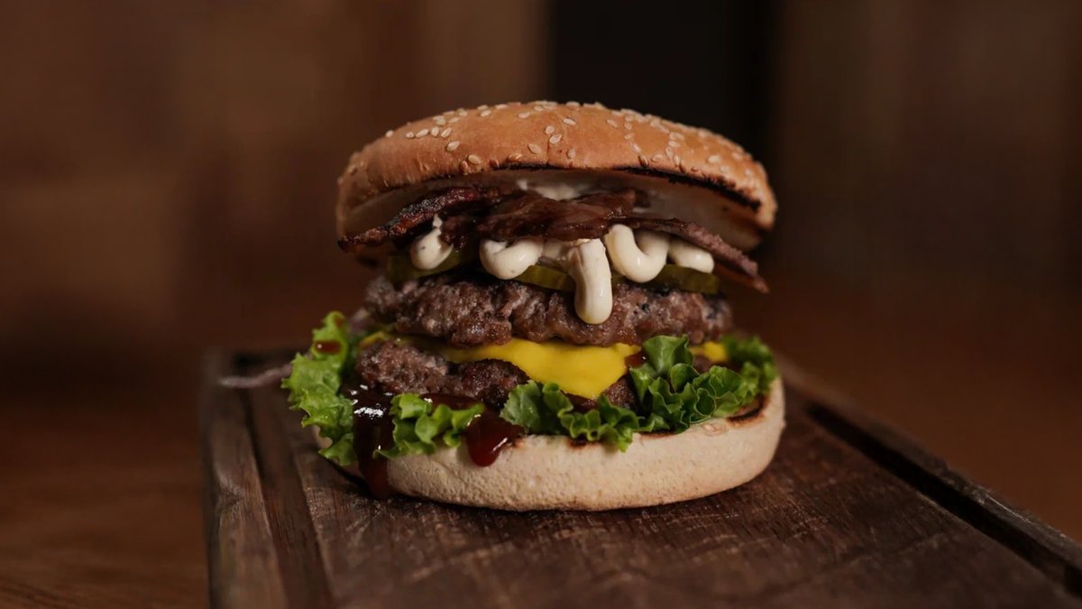 Булочка,салат, сыр Чеддер, маринованный огурец, маринованный лук, бекон из мраморной говядины, 2-е котлеты из говядины, соус ранч, соус BBQ