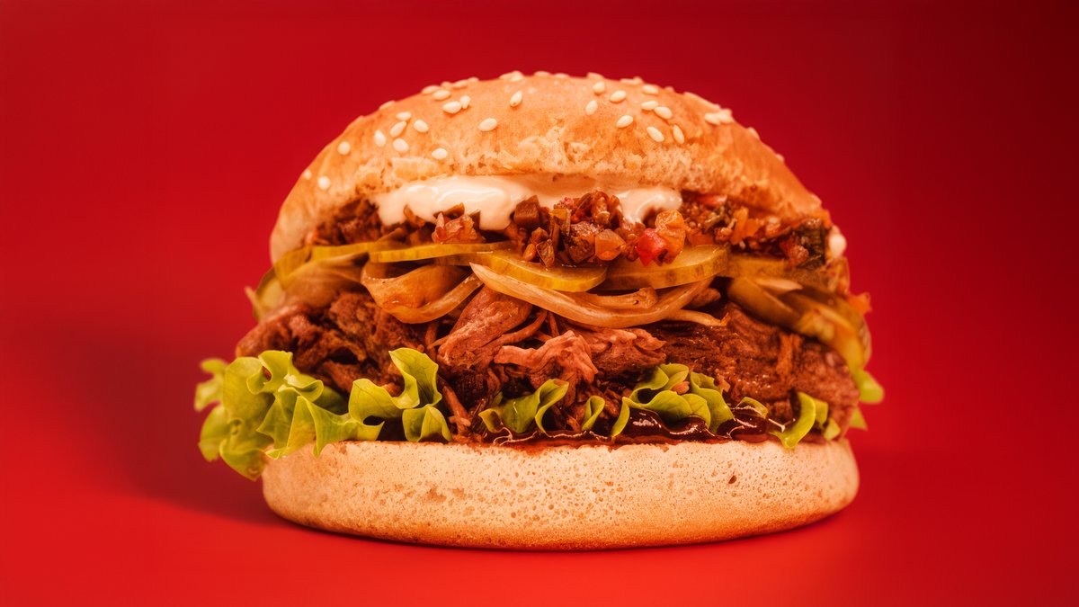 Булочка, томленная говядина, маринованные огурцы, перец халопенью, салат, красный лук, соус айоли, соус BBQ.