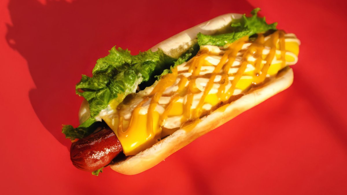 Булочка датская, сосиска говяжья, помидор, лист салата, сыр Чеддер, соус сырный, соус горчичный, соус айоли