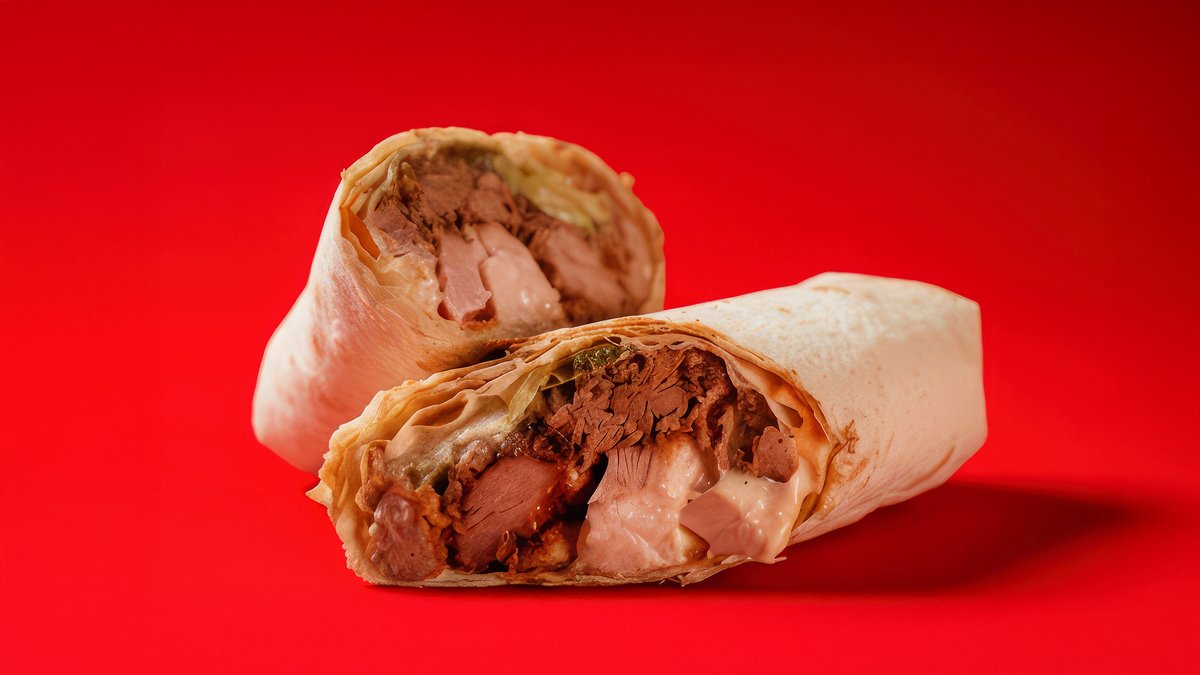 Лаваш, томленная говядина, грибной топпинг, салат, красный лук, маринованные огурцы, соус трюфельный.