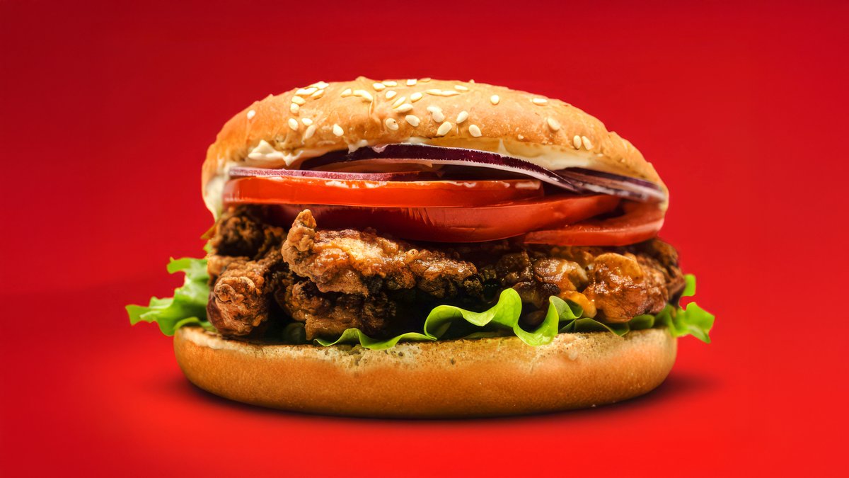 Булочка, курочка фри, салат, томат, красный лук, соус айоли, соус сырный.
