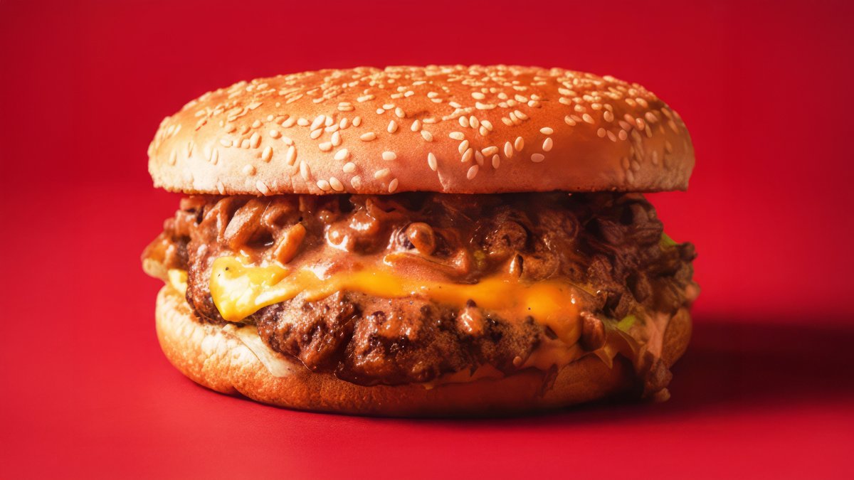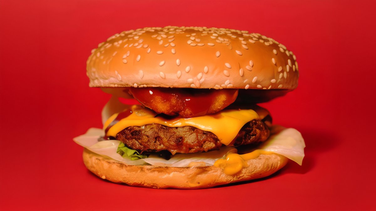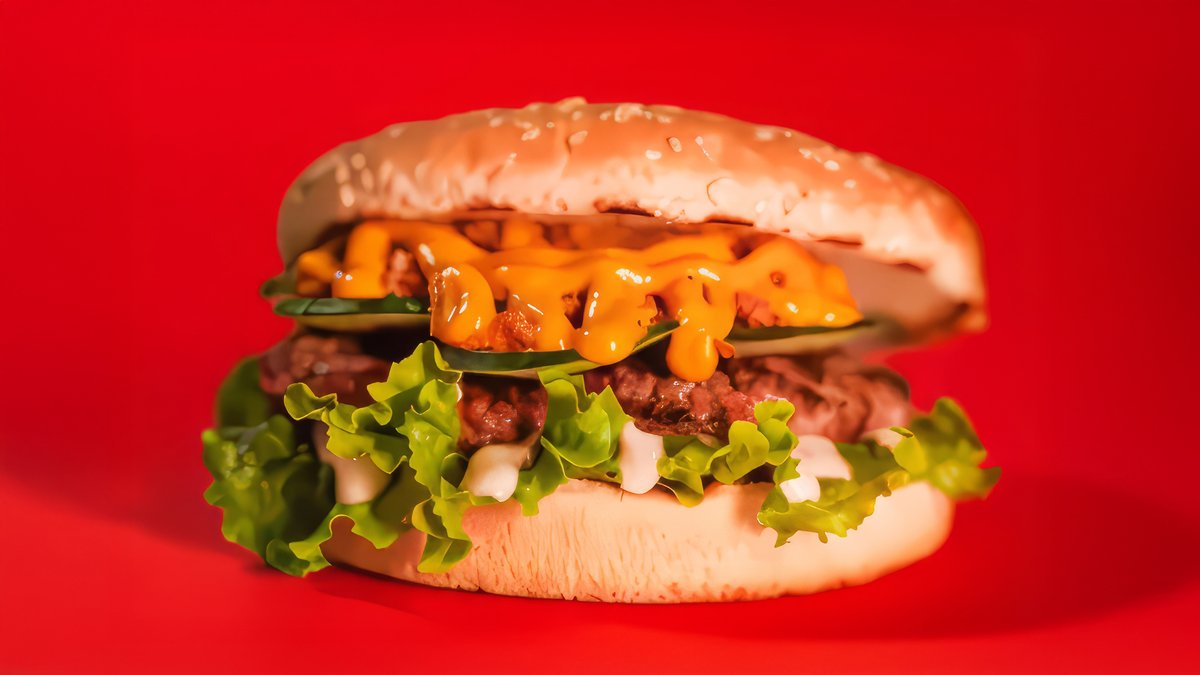 Булочка, котлета говяжья, салат, маринованные огурцы, сыр Чеддер, красный лук, соус айоли, соус томатный, соус BBQ.