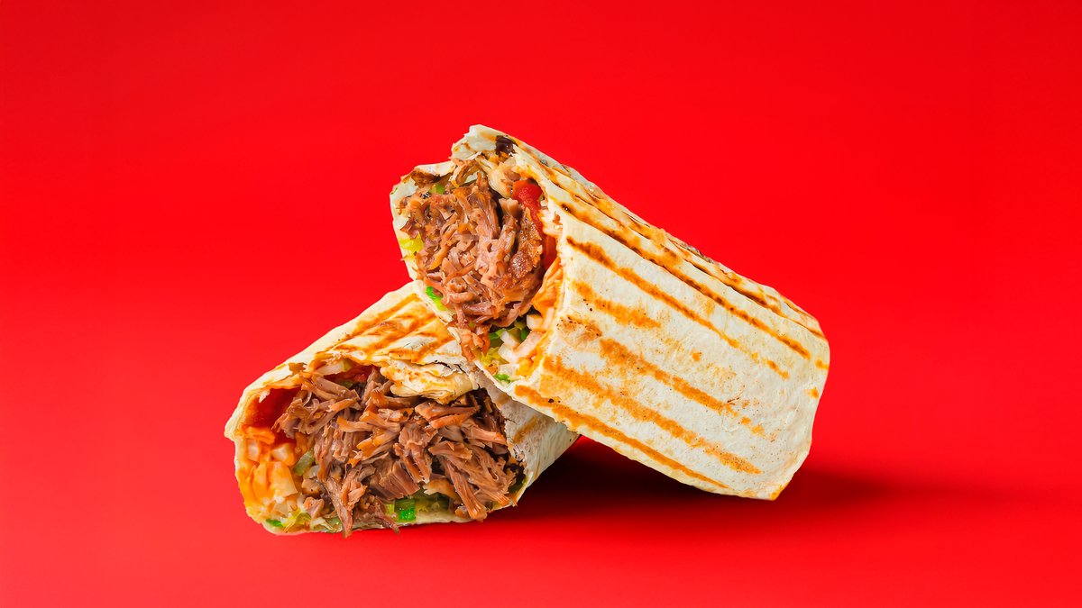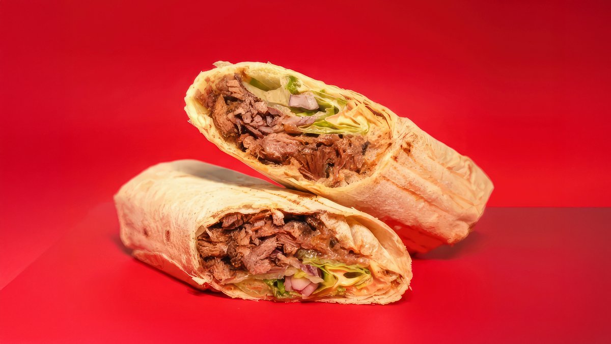 Лаваш, томленная говядина, картофель фри, томат, красный лук, соус айоли, соус томатный, соус BBQ