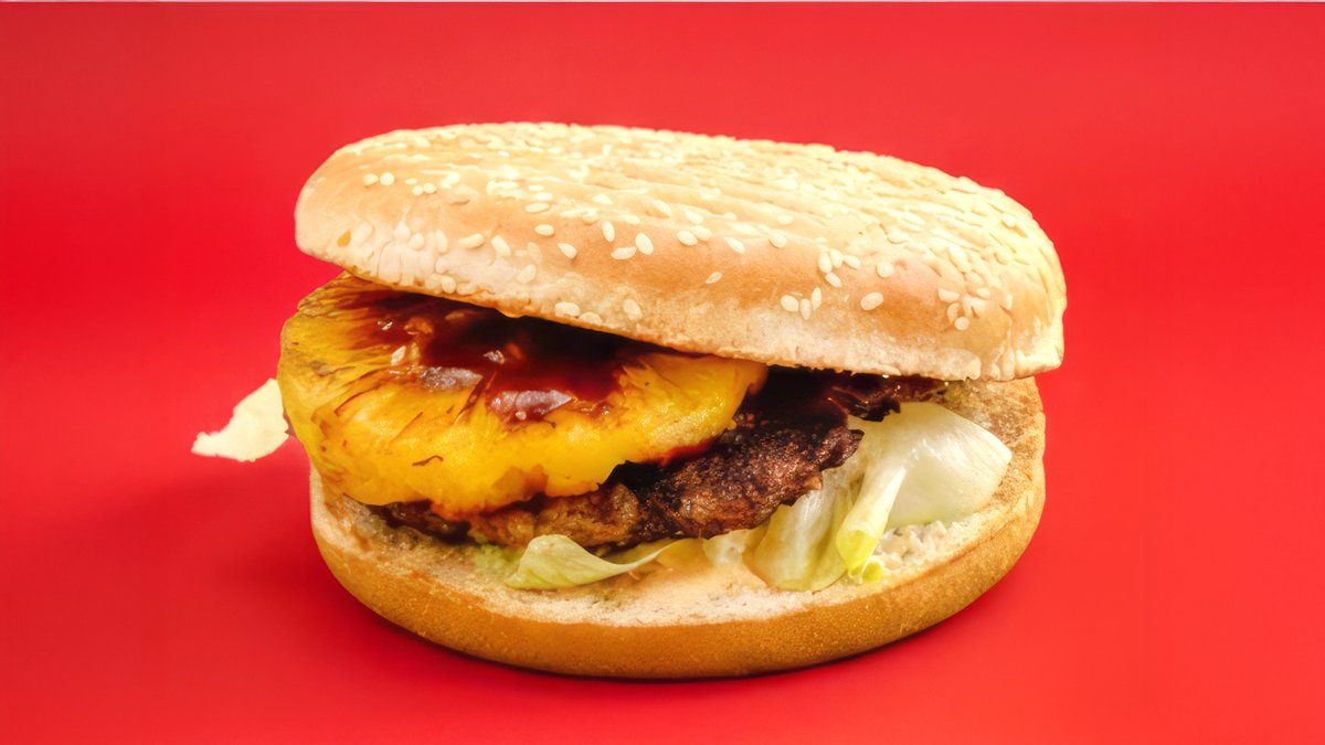 Булочка, котлета говяжья, ананас на гриле, карамельный лук фри, салат, соус Гавайский, соус BBQ.