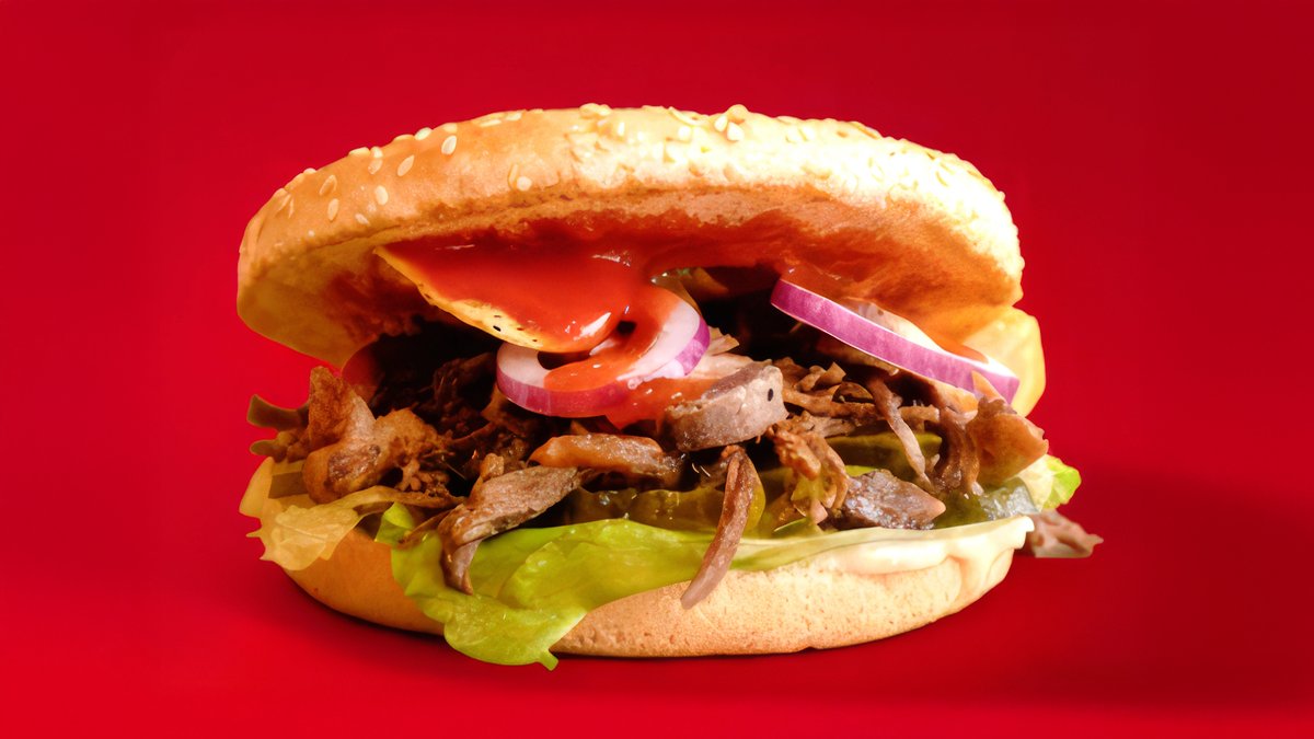 Булочка, томленная говядина, казы, салат, маринованные огурцы, красный лук, чипсы, соус айоли, соус томатный.