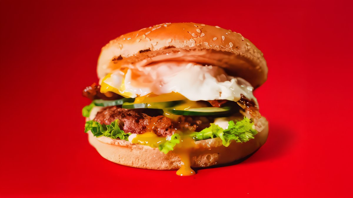Булочка, котлета говяжья, лист салата, свежий огурец, бекон из мраморной говядины, яйцо, соус айоли, соус трюфельный