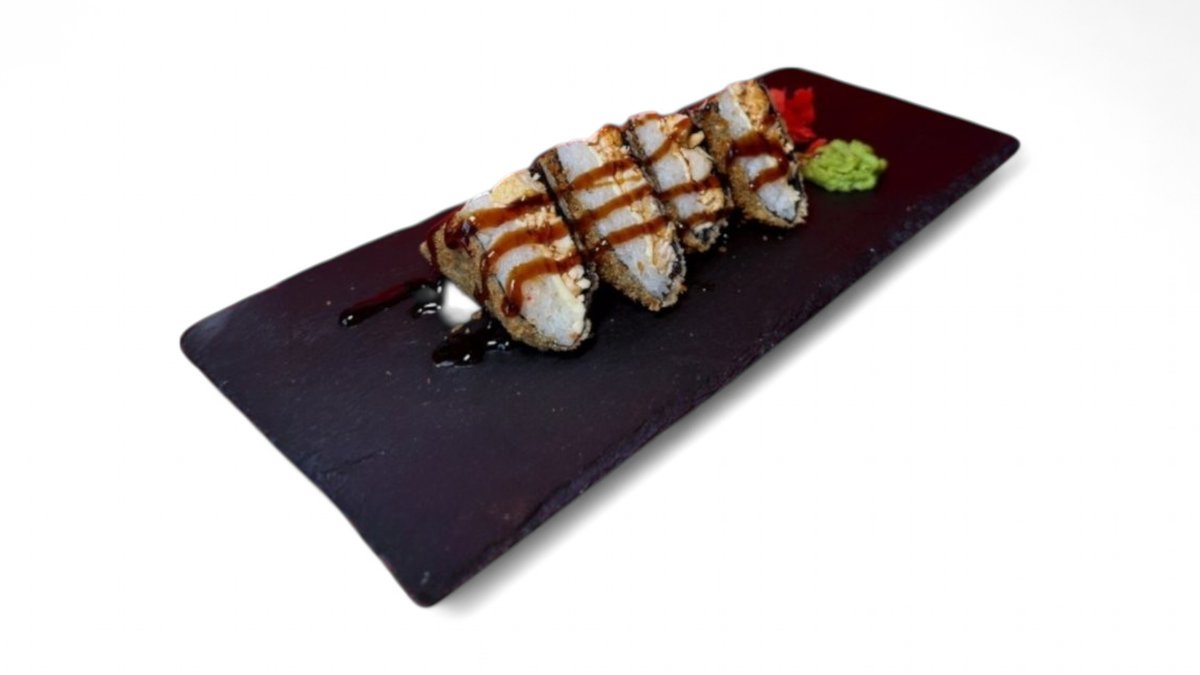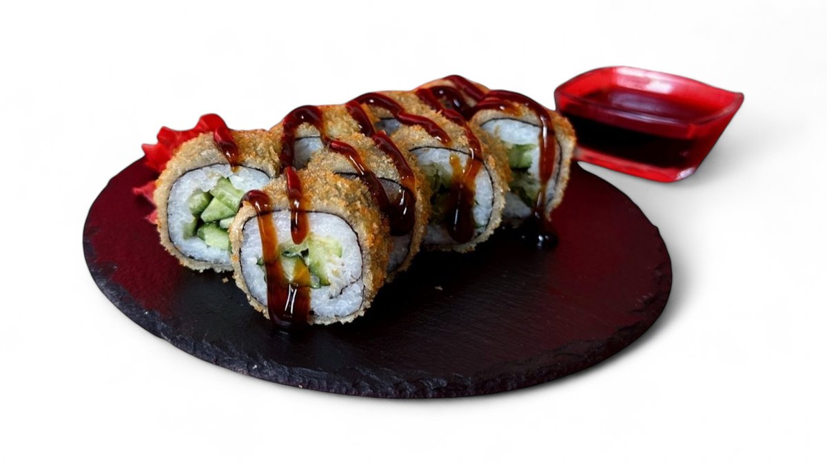 В его основе рис, аккуратно разрезанный пополам. Внутри сочные креветки, творожный сыр и бутербродный сыр, которые создают идеальную текстурную гармонию. Сверху — три хрустящие жареные креветки, салат чука, фирменный соус унаги и соус Калифорния.