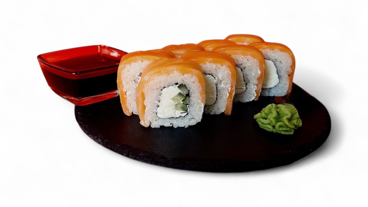 Нежный лосось, полностью окутывающий рисовый шар, с щедрой шапкой авторского сливочного крема с манго. Украшен икрой и свежей зеленью. Мягкий, сливочный, с лёгкой фруктовой свежестью.