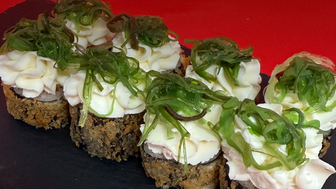 Хрустящий жареный ролл из сочного лосося и нежного риса, а сверху — воздушная шапочка из сливочного творожного сыра, увенчанная свежим морским салатом чука.