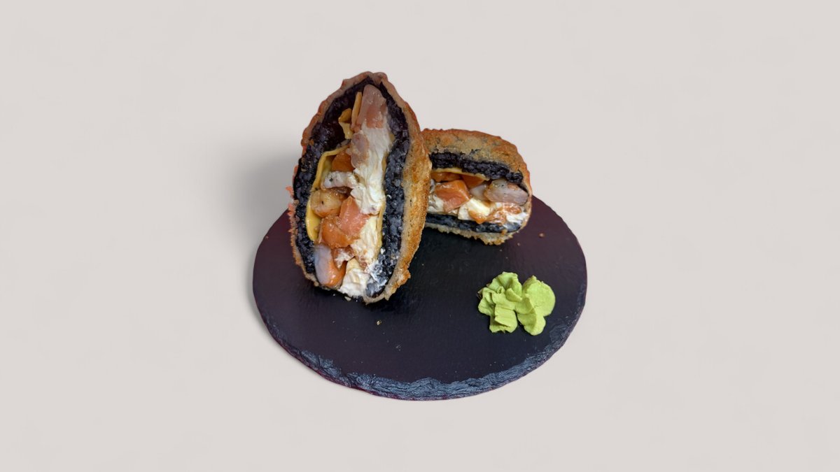 Гурманская интерпретация суши бургера: чёрный рис, осьминоги, креветки, лосось и два вида сыра в хрустящей оболочке.