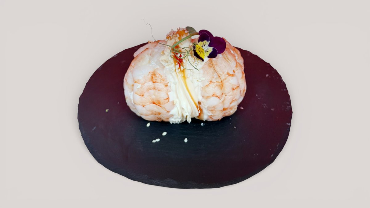 Сочные тигровые креветки, сливочный крем с мягкой сладко-пикантной ноткой чили и воздушная текстура. Посыпка кунжутом и свежая зелень подчёркивают вкус и делают подачу по-настоящему эффектной.