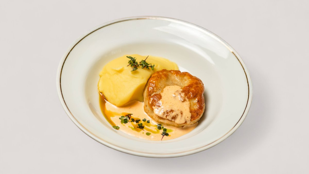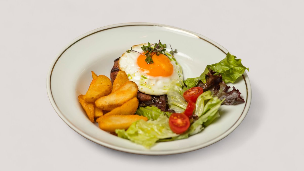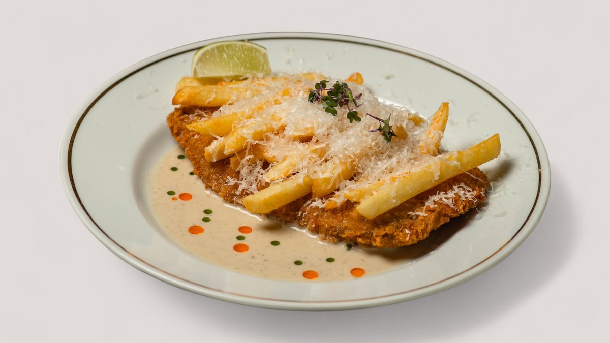 Куриный шницель с пармезаном, с соусом, черным перцем и фри