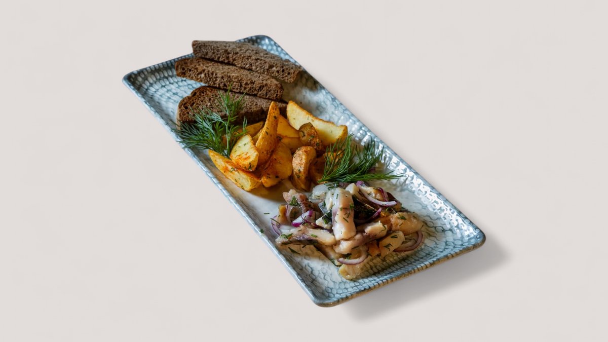 Скумбрия с жареным картофелем и маринованным луком