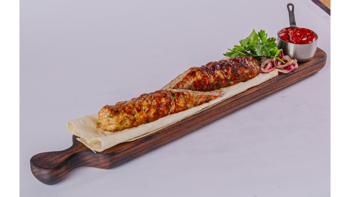 Сочный люля-кебаб,который мы готовим из лопатки ягненка.Подаем с лавашом,томатным соусом,маринованным луком и свежей зеленью