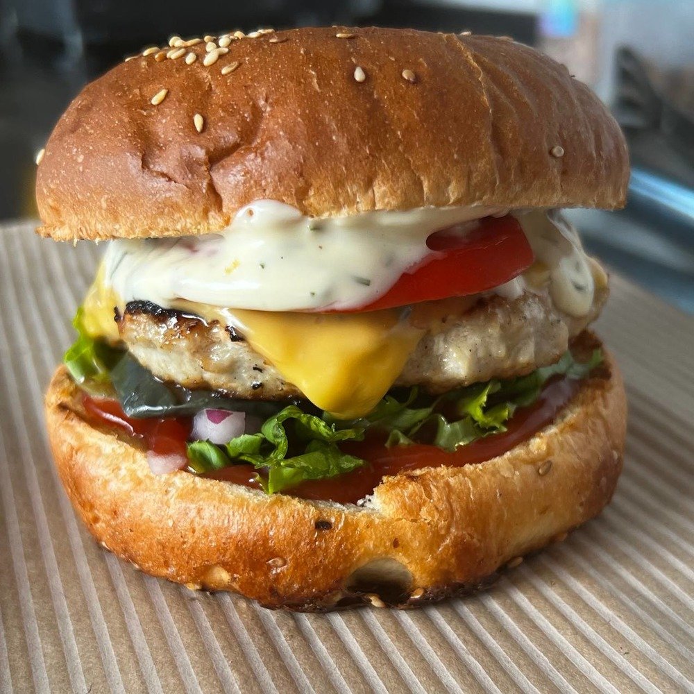 фирменная булочка, куриная котлета собственного производства, лист салата, красный лук, соленный огурец, помидор, сыр чеддер, фирменный соус