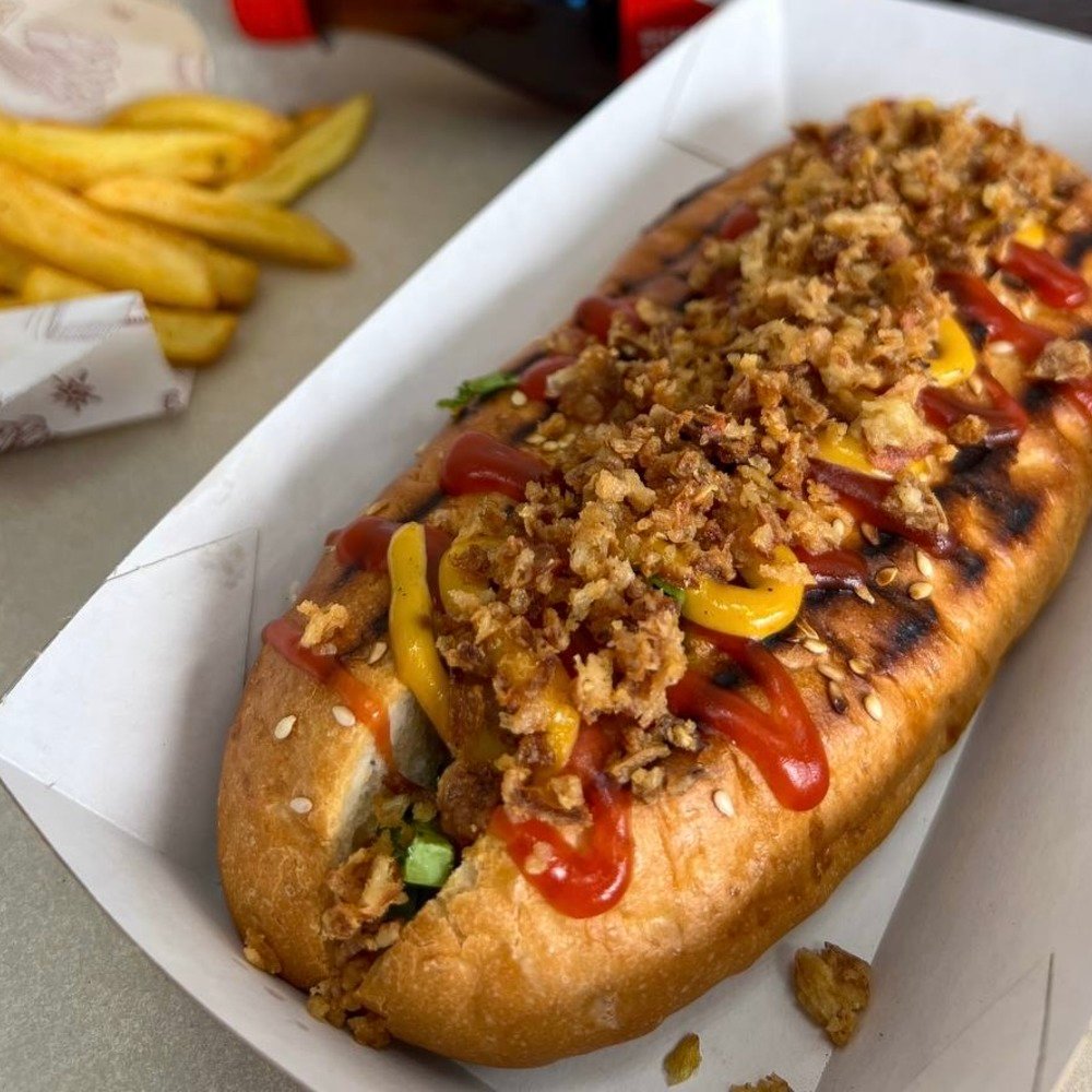 фирменная булочка, говяжья колбаска гриль собственного производства 80гр, лист салата, соленный огурец, хрустящий лук, фирменный соус