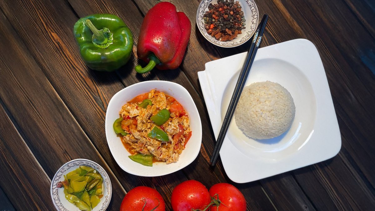 с зеленым луком и красным перцем