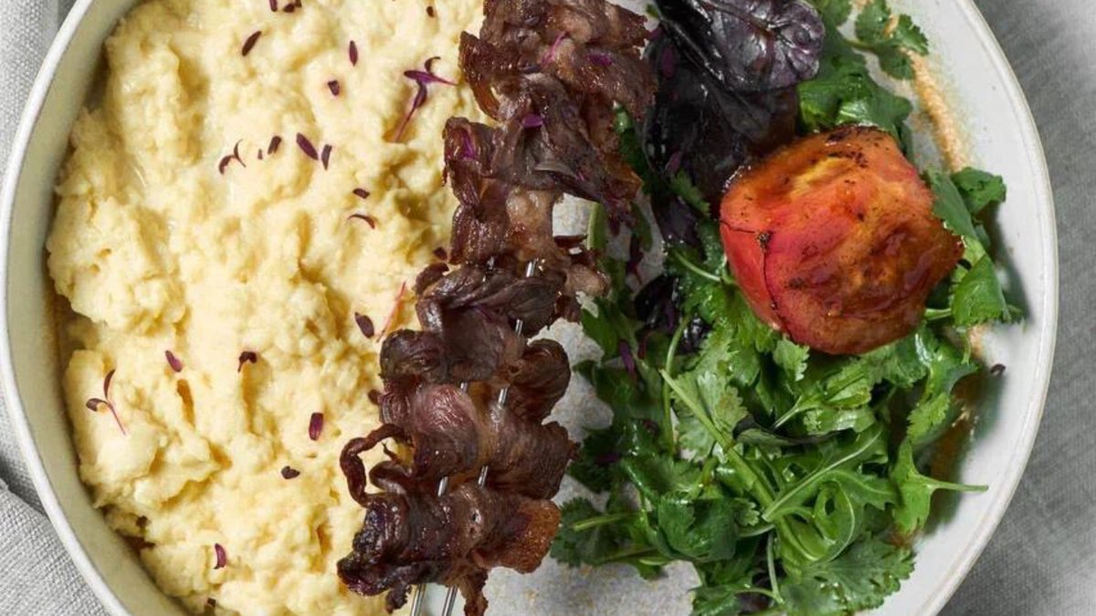Глазунья с халуми, греческий йогурт и топенада из оливок