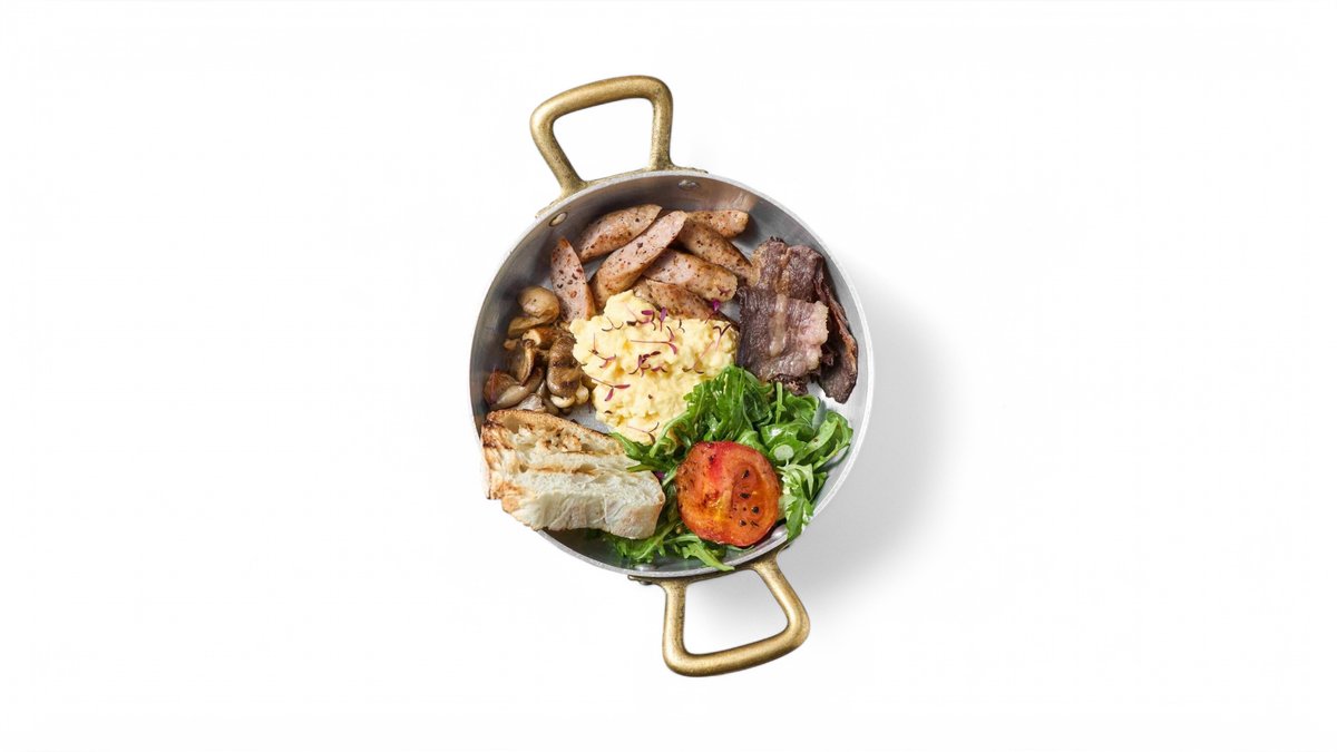 Скрэмбл с беконом, томат на углях,кавказкая зелень