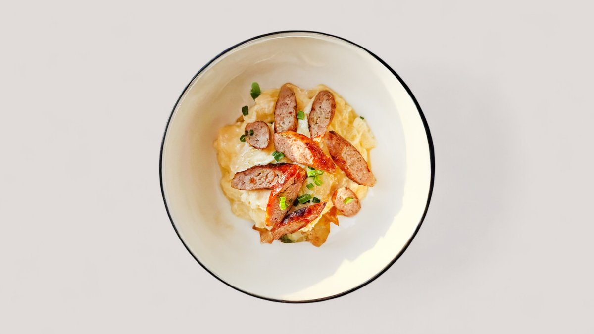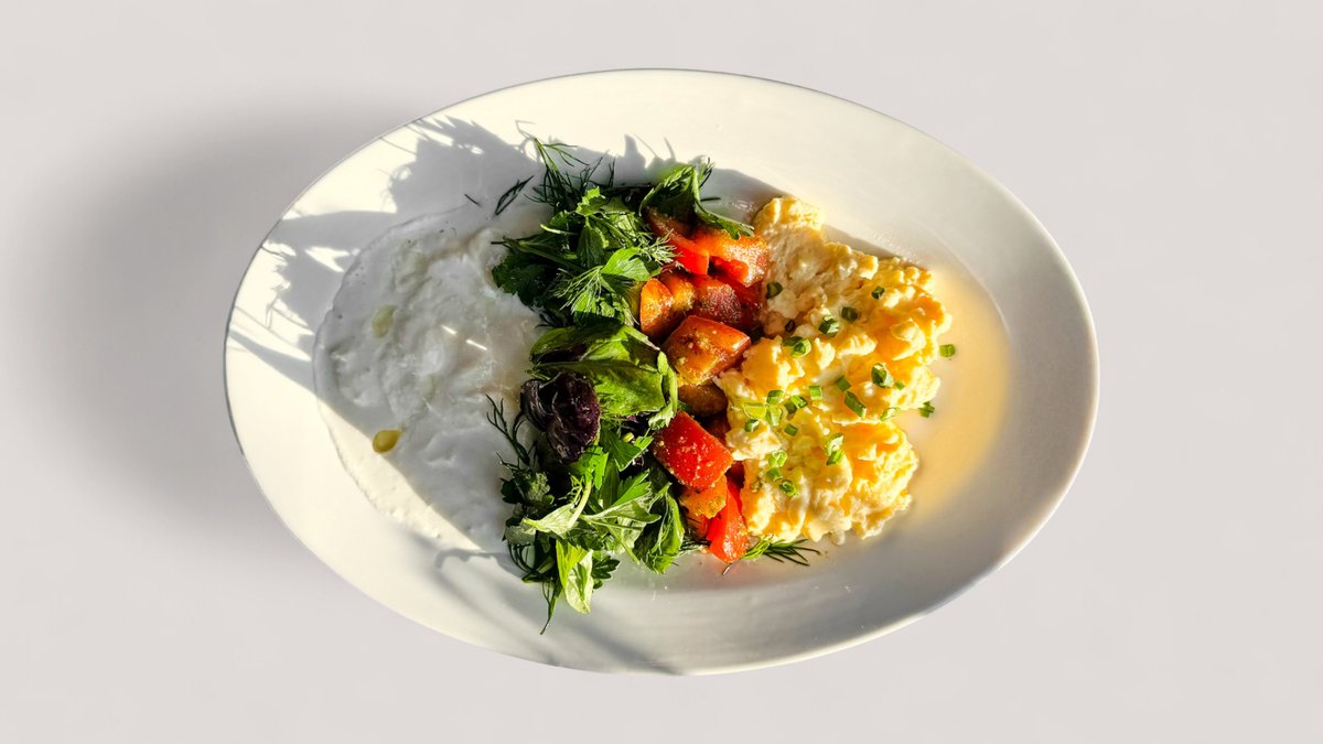 Глазунья с халуми, греческий йогурт и топенада из оливок