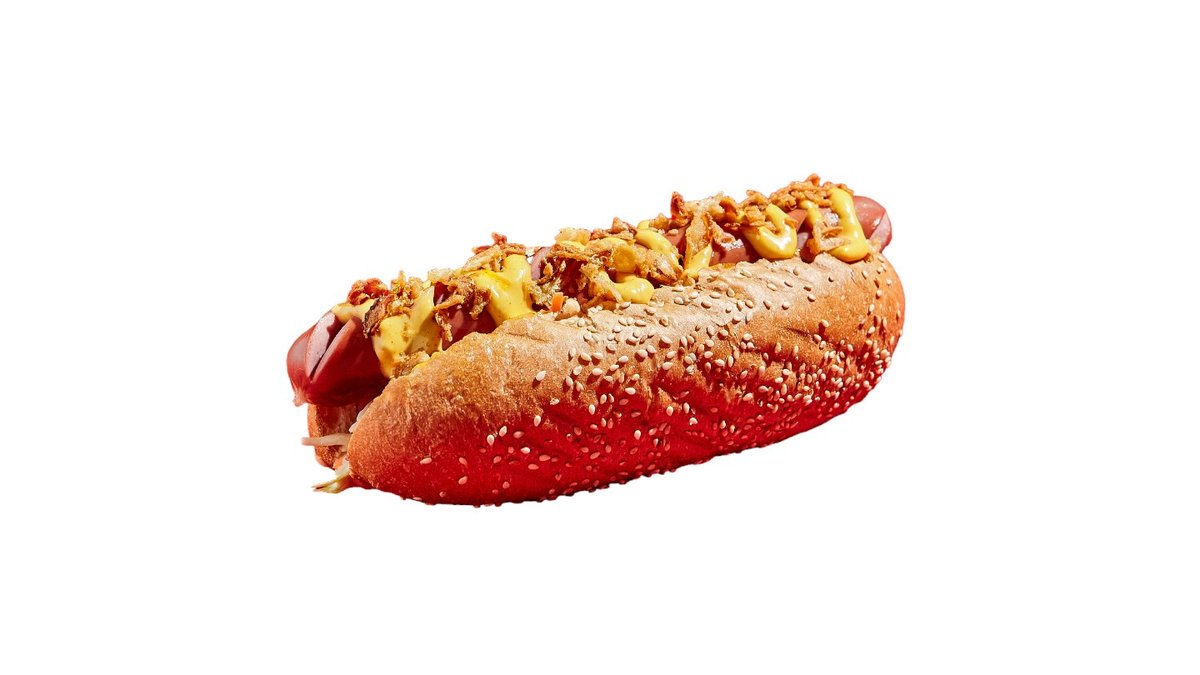 Булочка хот-дог,говяжья сосиска,кетчуп,горчица,лук красный,огурец соленый,морковь