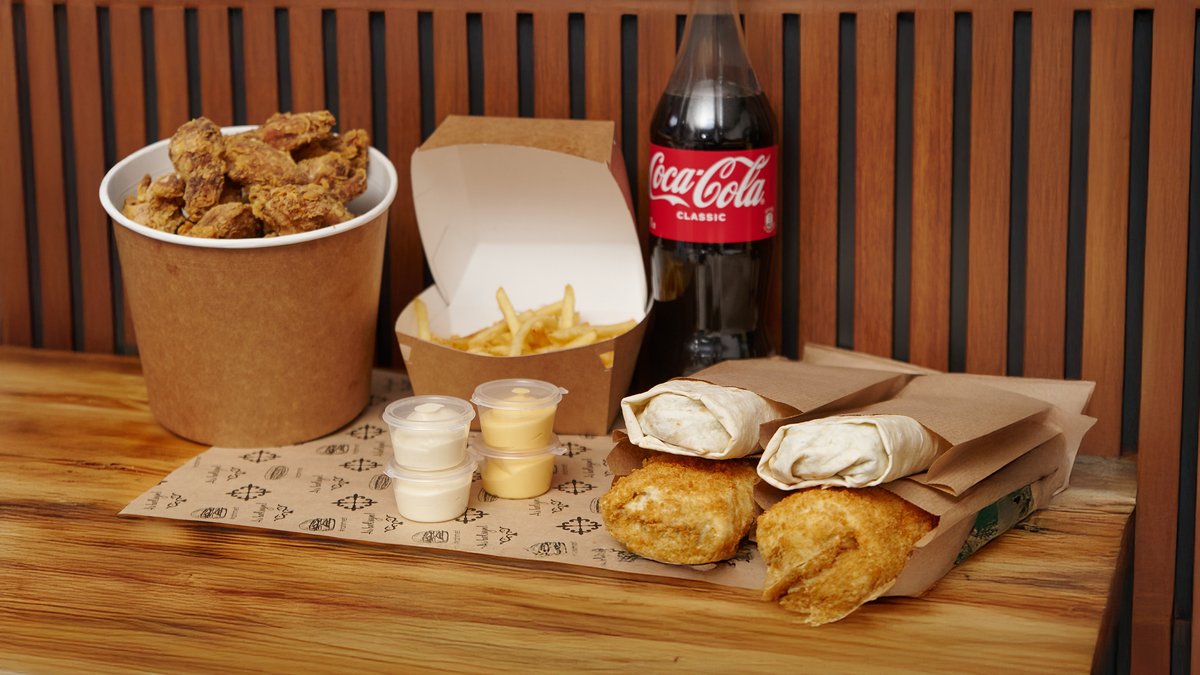 Крылышки – 20 шт Фри 2 порции соус чесночный 2 шт соус сырный 2 шт стандартные донеры 2 шт (на выбор Retro Doner или Донер Цезарь) жареные донеры 2 шт на выбор (донер Пикантный или донер Грибной ) Coca-Cola 1 литр