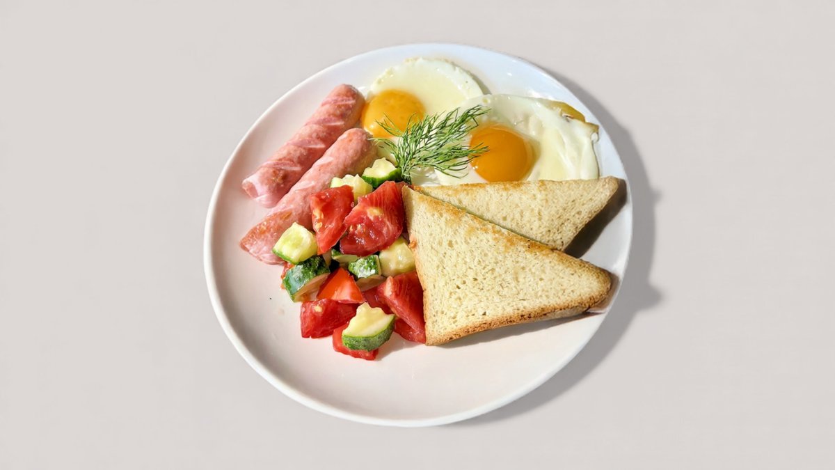 Сосиски, яйца, свежий салат, тост. хлеб, черный кофе