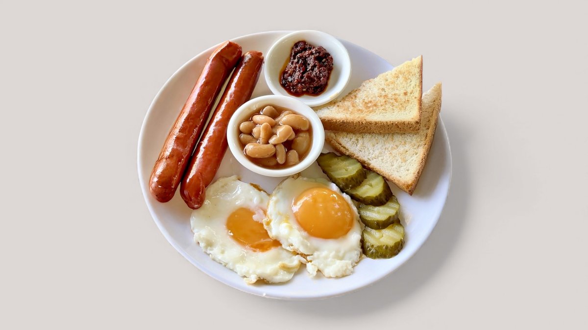 Охотничьи колбаски, яйца, соленые огурцы, тост. хлеб, черный кофе