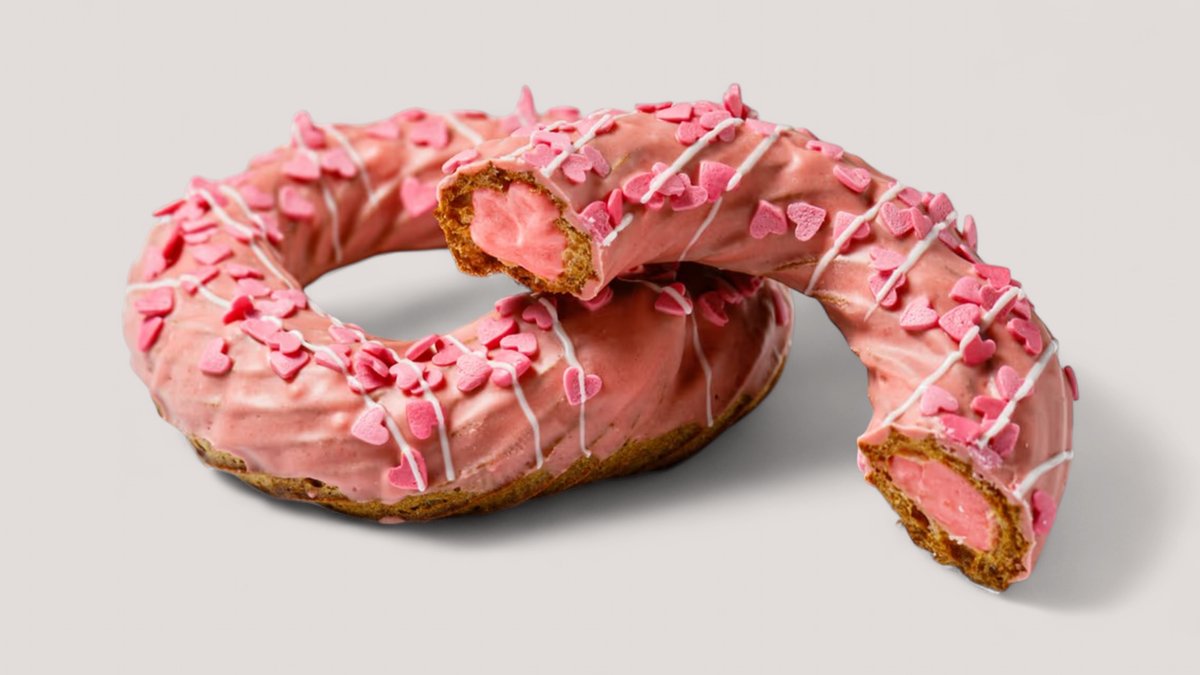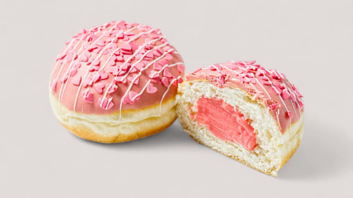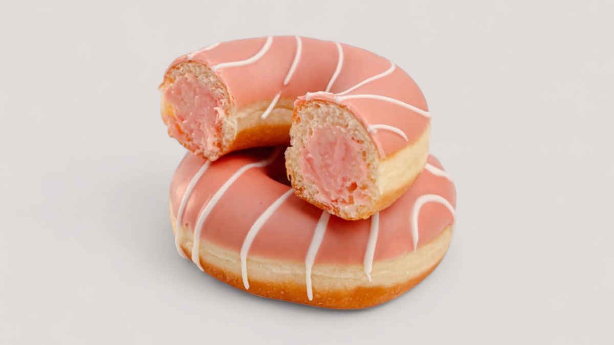 Донат в клубничном шоколаде и нежным клубнично-сливочным кремом.
