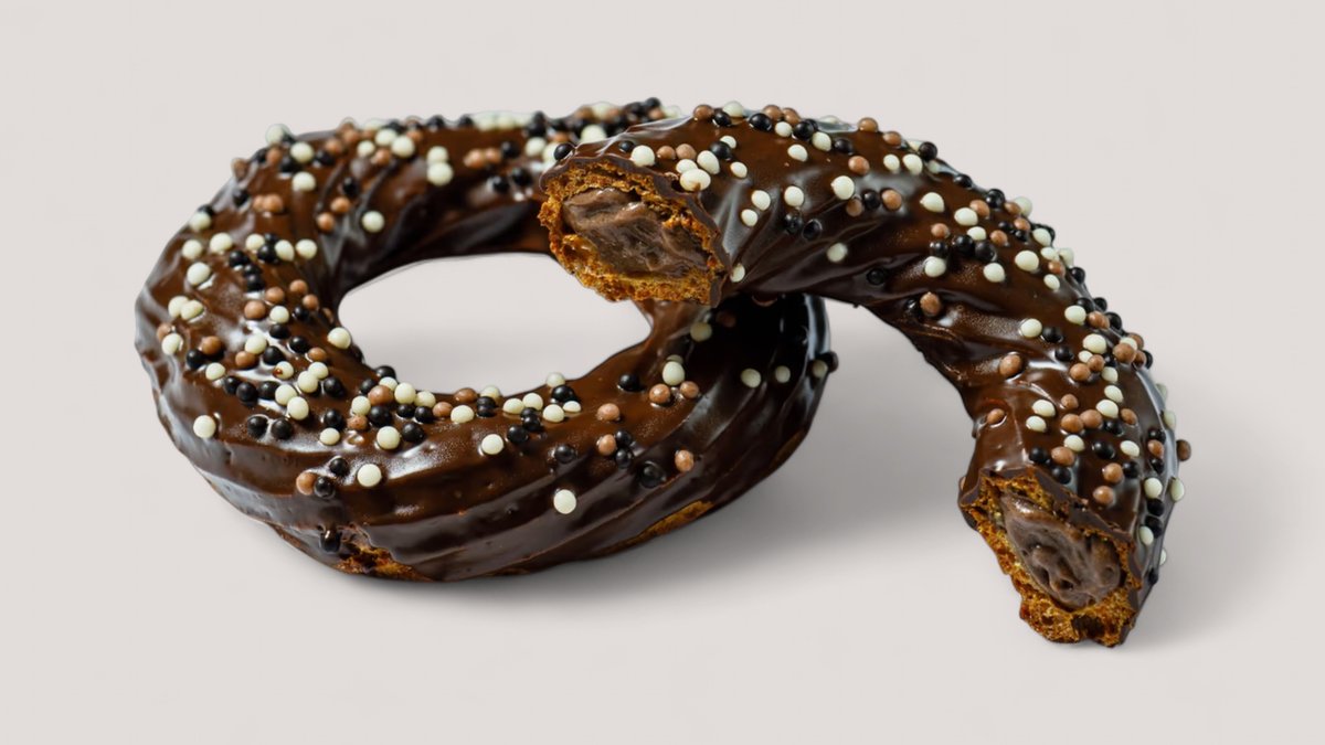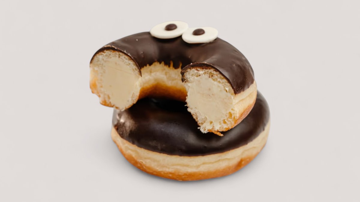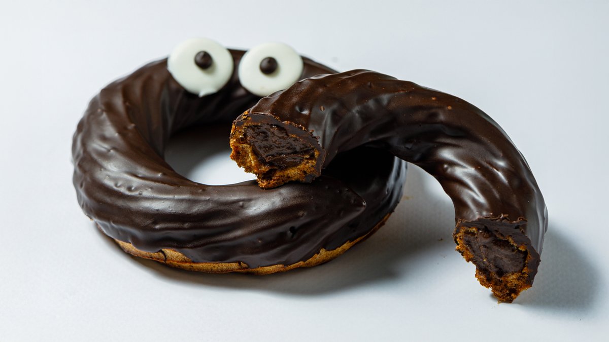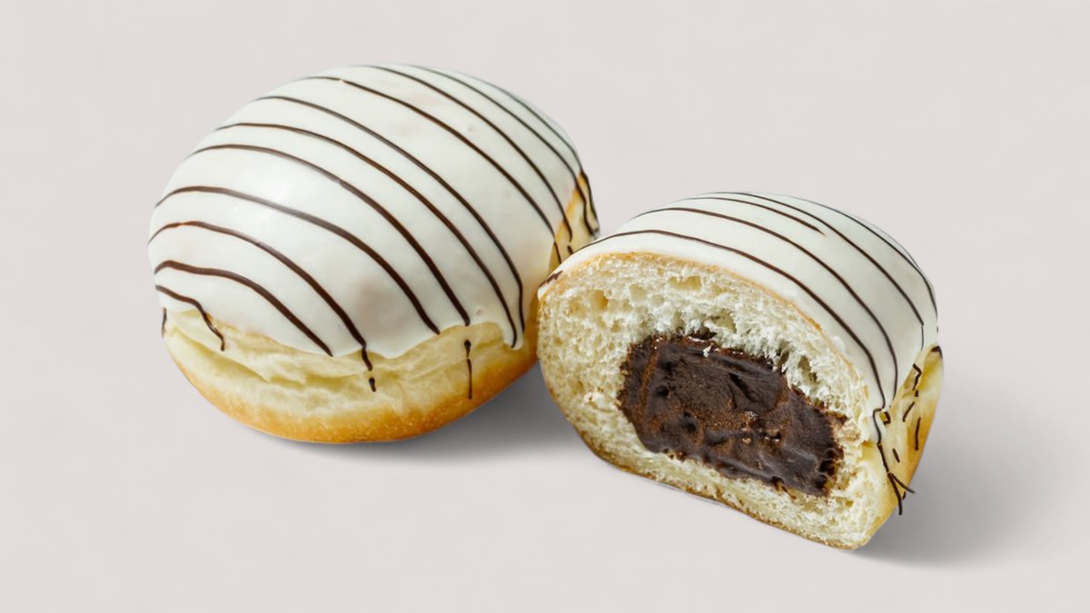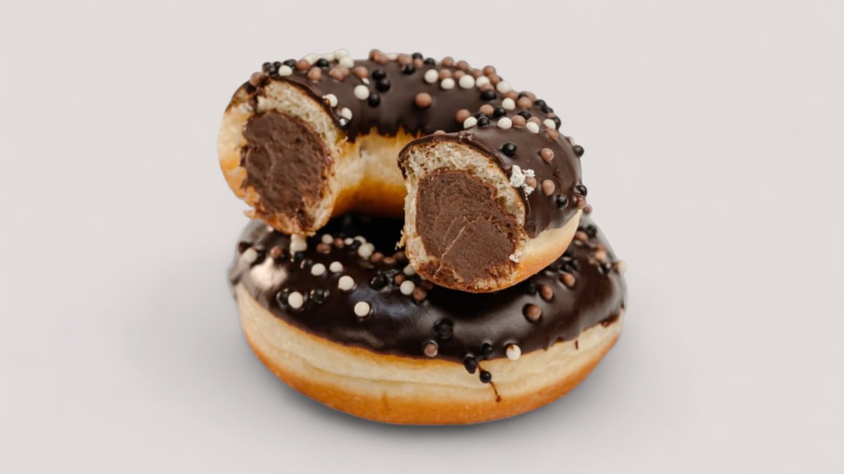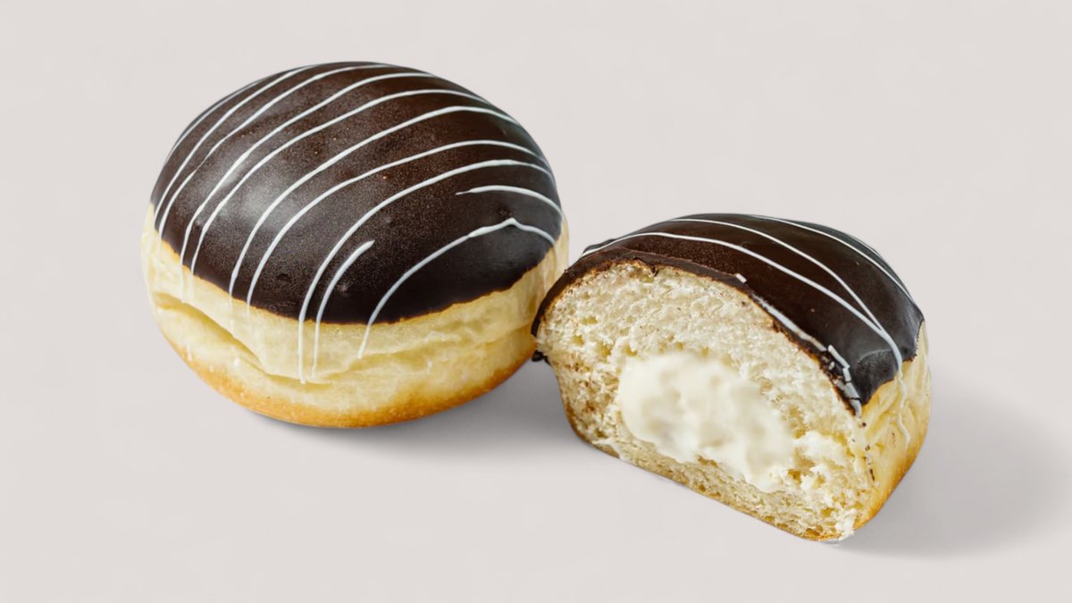 Донат в шоколадно-банановой глазури и нежной бананово-кремовой начинкой.