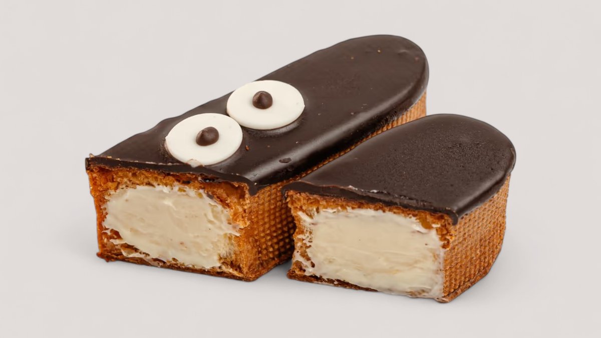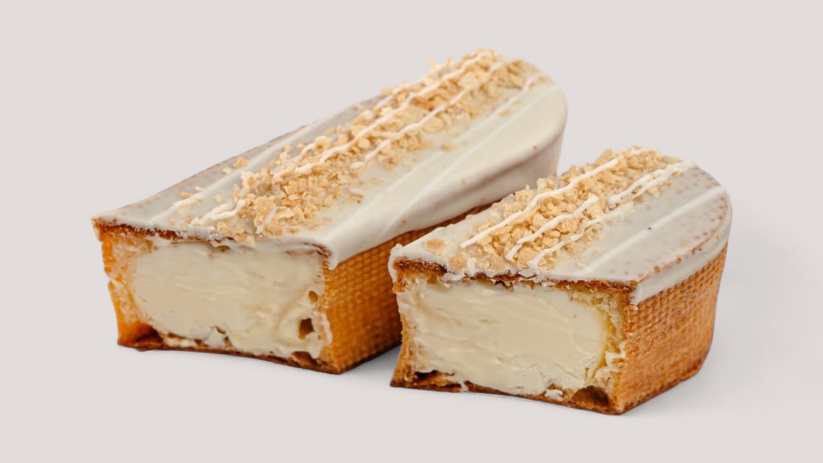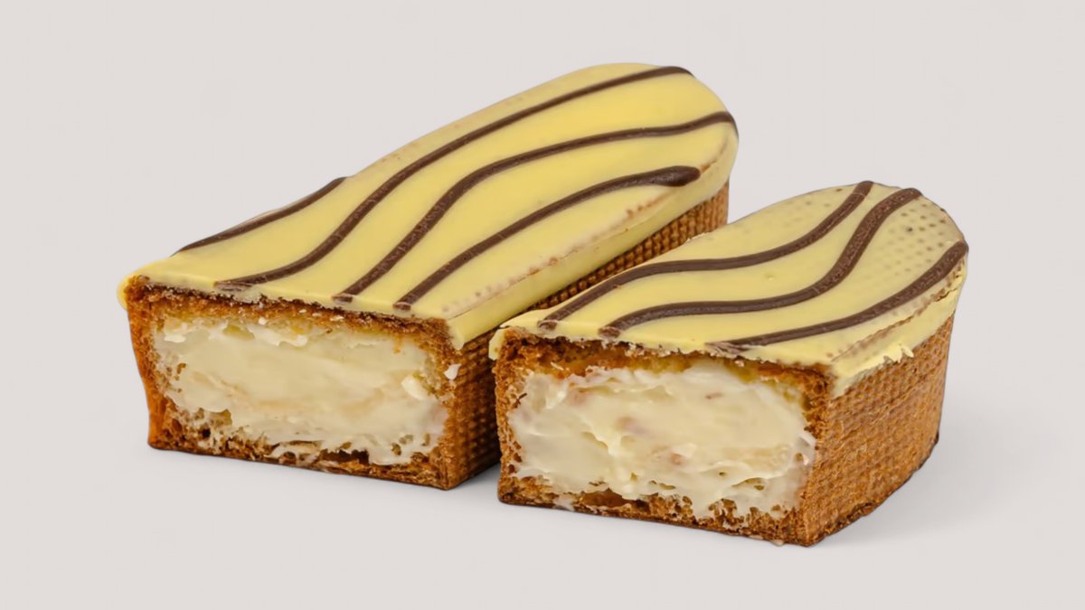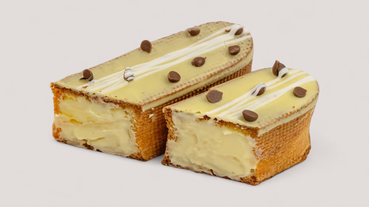 Эклер в белом молочном шоколаде и начинкой с сливочным сыром и ванильным кремом, посыпка хрустящая вафельная стружка.