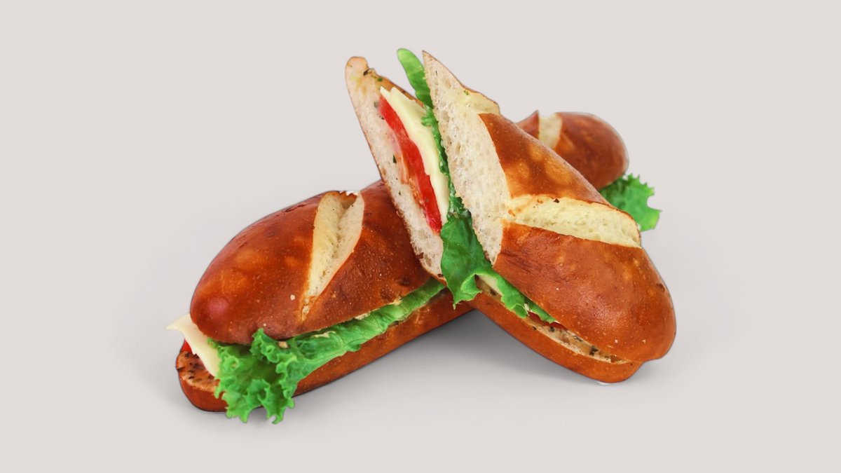 Багет брецель, куриная ветчина, свежие огурцы, помидор, сыр моцарелла, чесночный соус