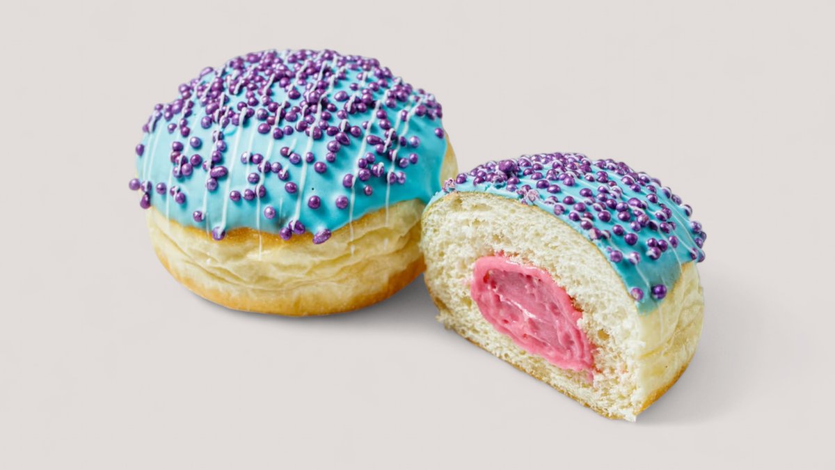 Пончик в голубой шоколадной глазури и ванильно-черничным кремом, воздушными зёрнами риса в какао глазури сиреневого цвета
