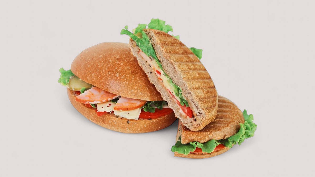 Воздушная булочка панини, куриная ветчина, соленые огурцы, помидор, сметанный сыр, чесночный соус