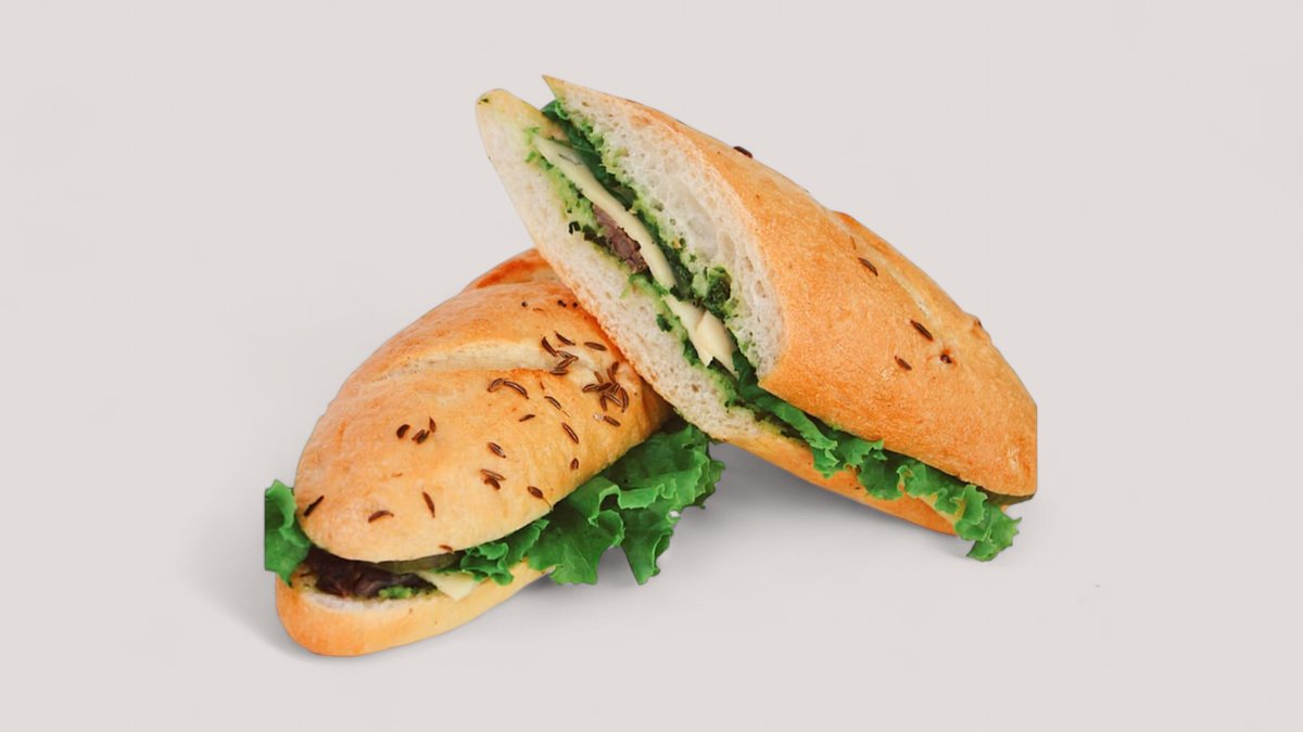 Хрустящий багет с тмином и морской солью, отварная говядина, соленые огурцы, салатный лист, сыр моцарелла, соус песто