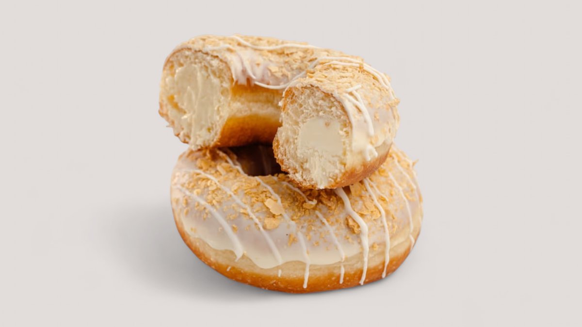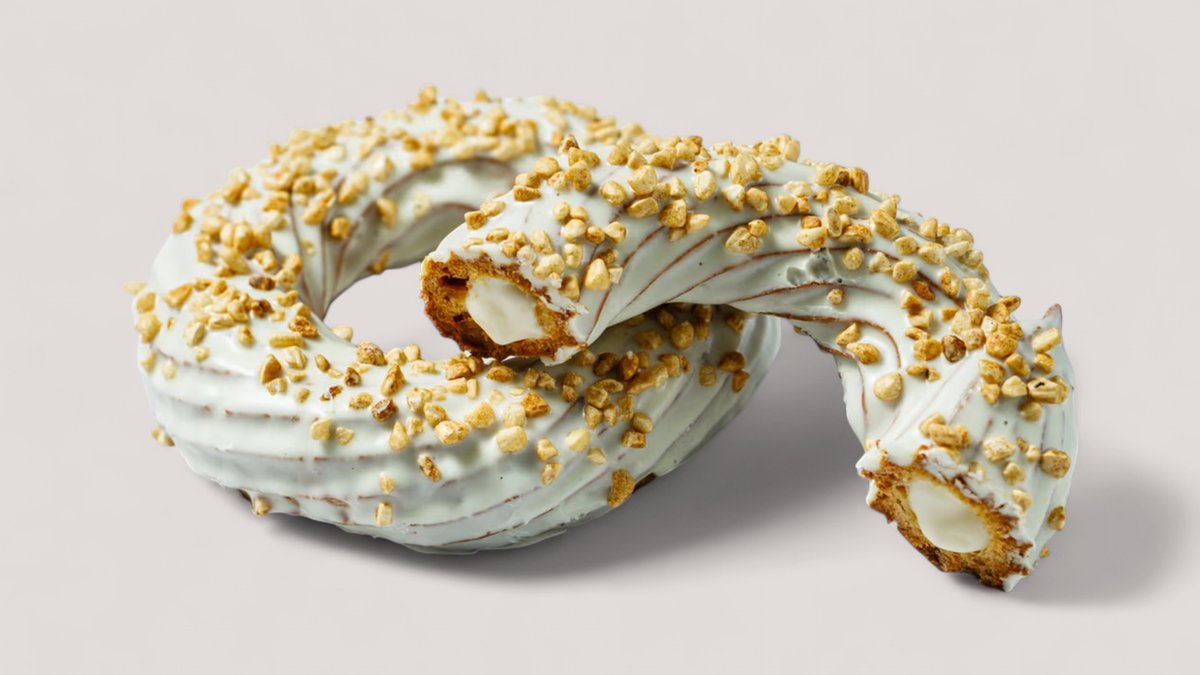 Донат в белом молочном шоколаде и начинкой с сливочным сыром и ванильным кремом, посыпка хрустящая вафельная стружка