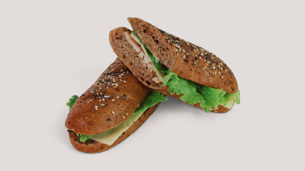 Хрустящий багет с тмином и морской солью, запеченная куриная грудка, свежие огурцы, помидор, сыр моцарелла, чесночный соус