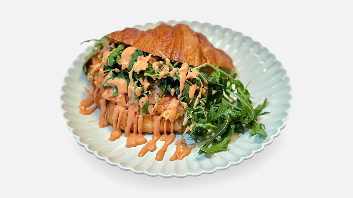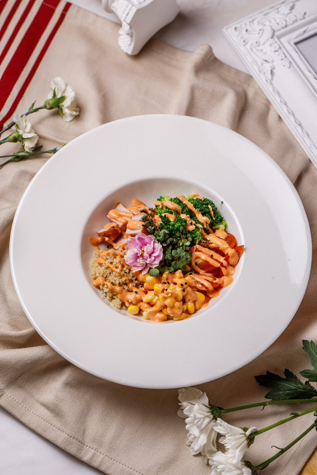 Завтрак со скремблом, хумусом, микс салатом и тартином с индейкой копченой