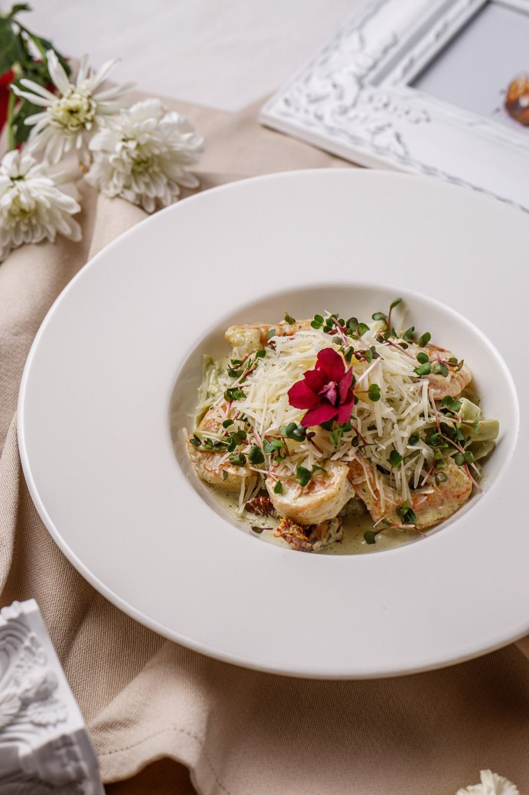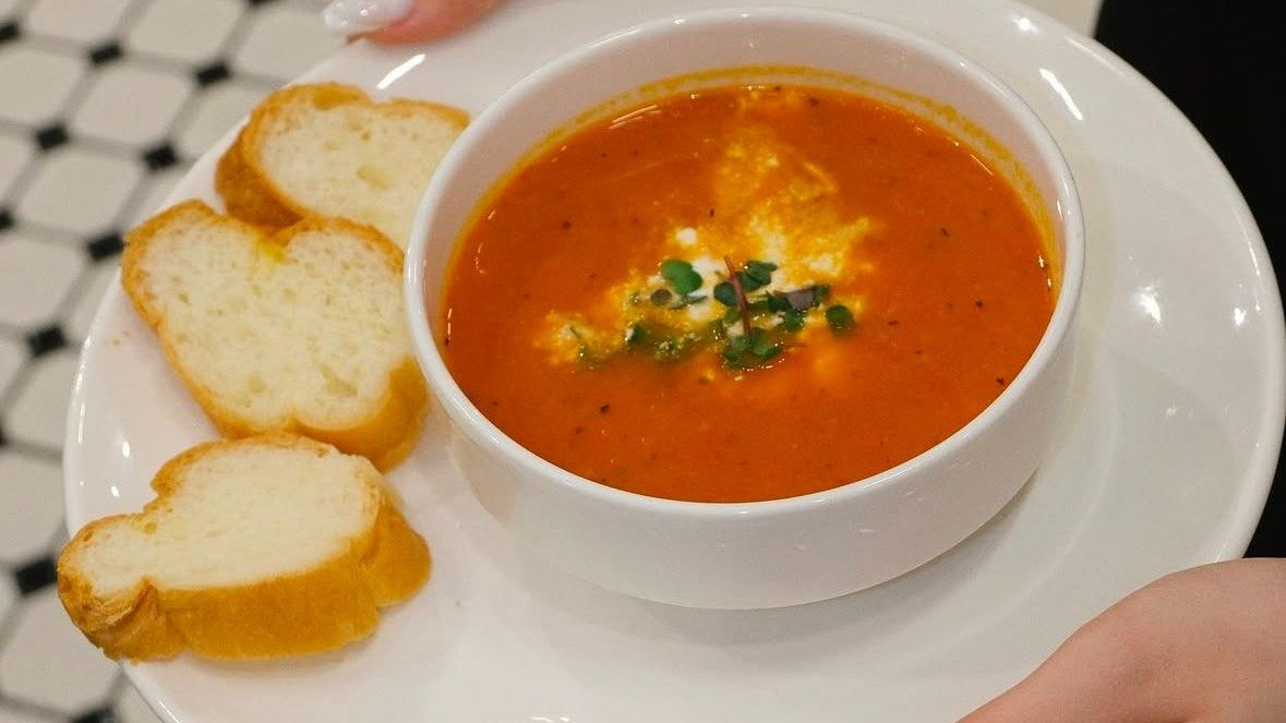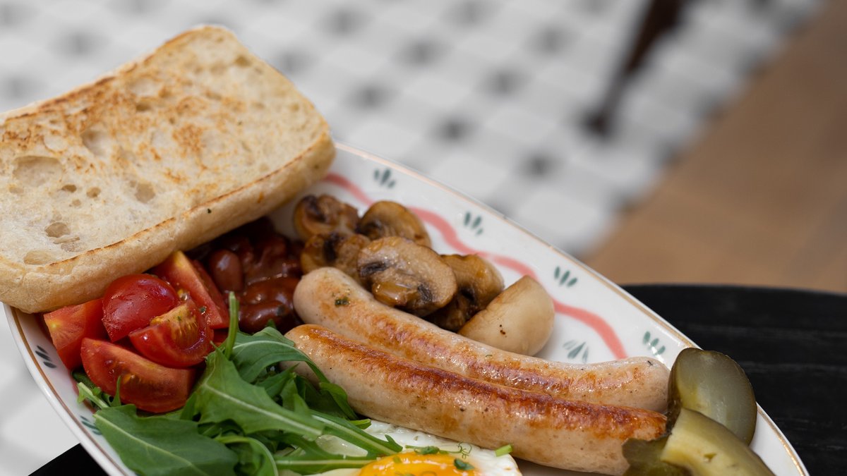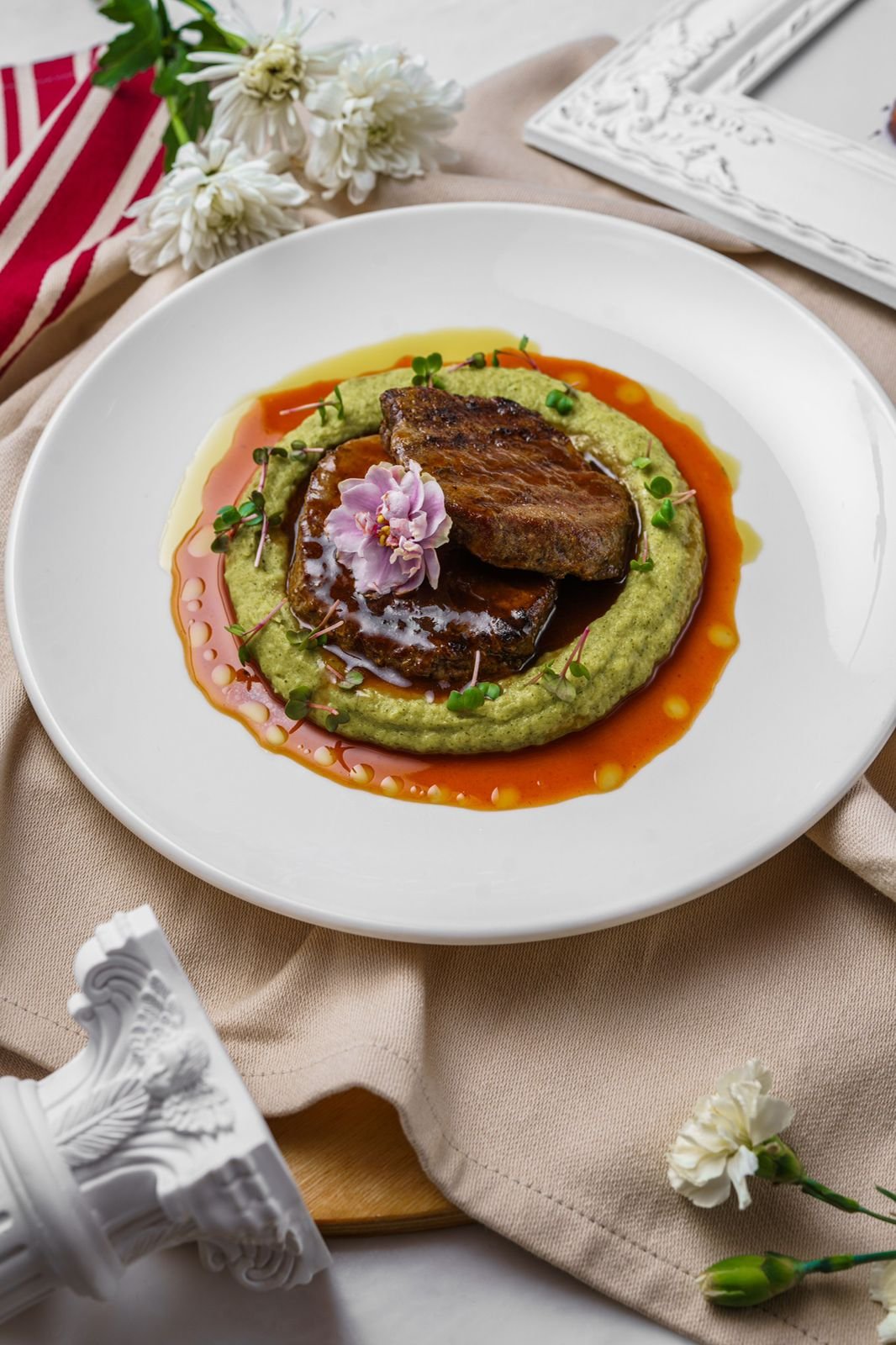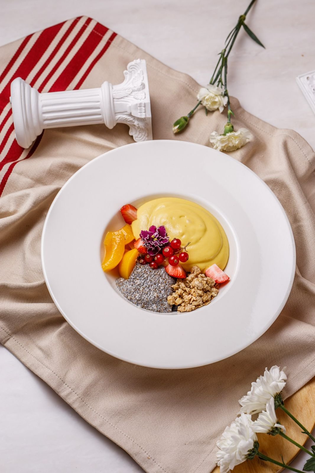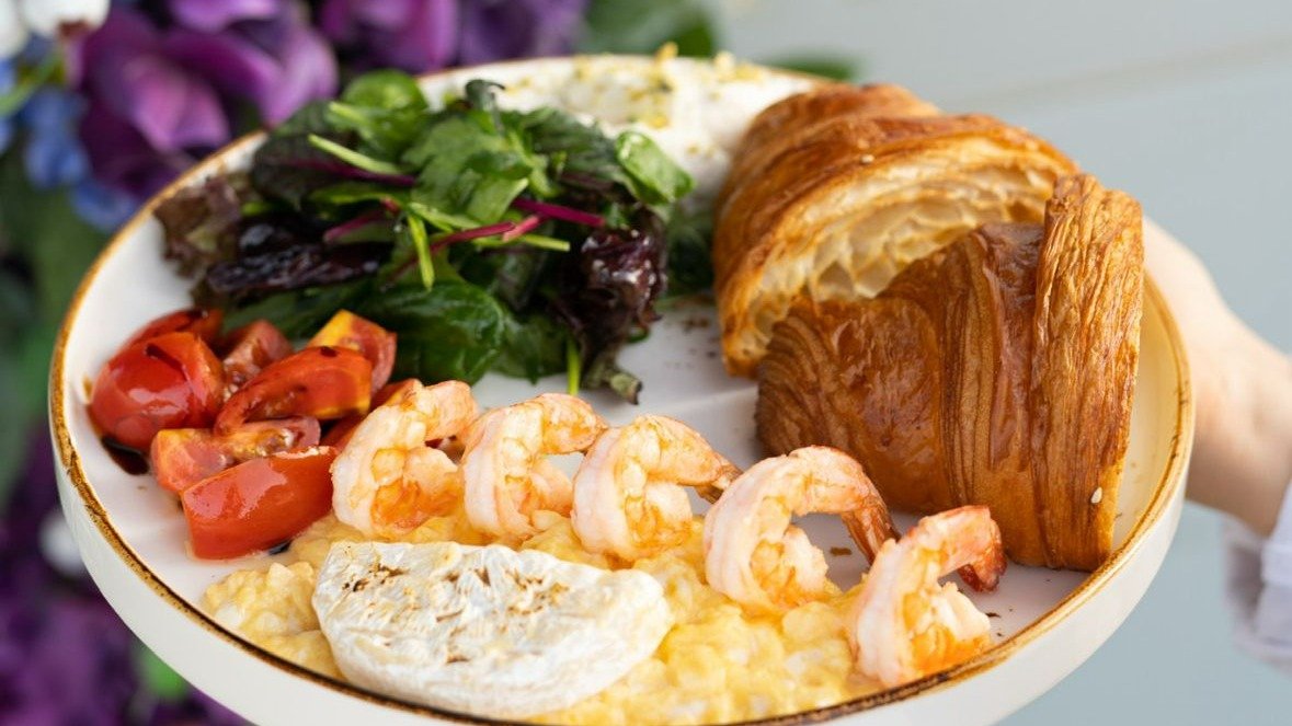 Завтрак со скремблом, хумусом, микс салатом и тартином с телятиной копченой