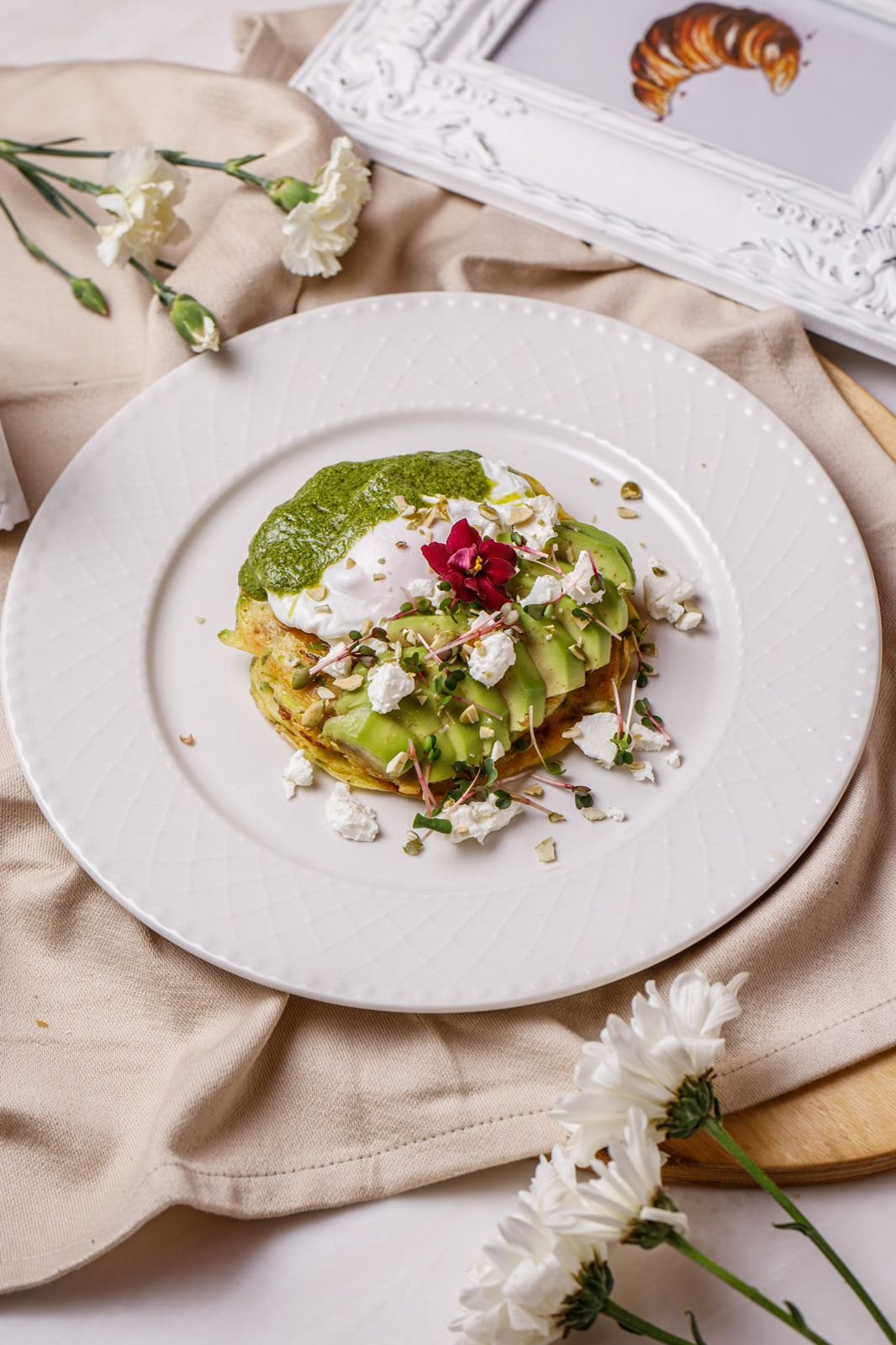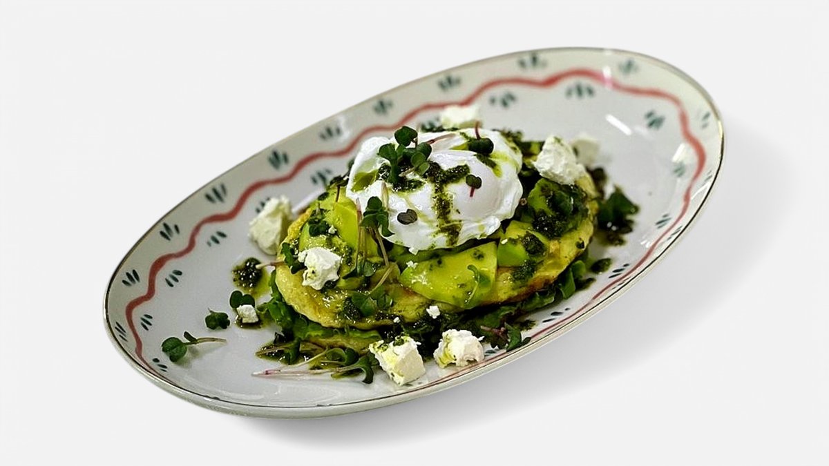 Кабачковый драник с авокадо, яйцом пашот, фетой и шпинатным соусом