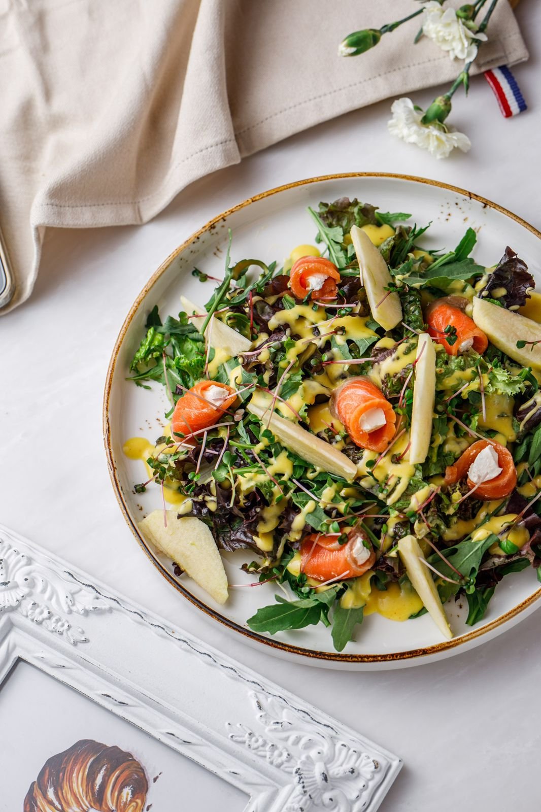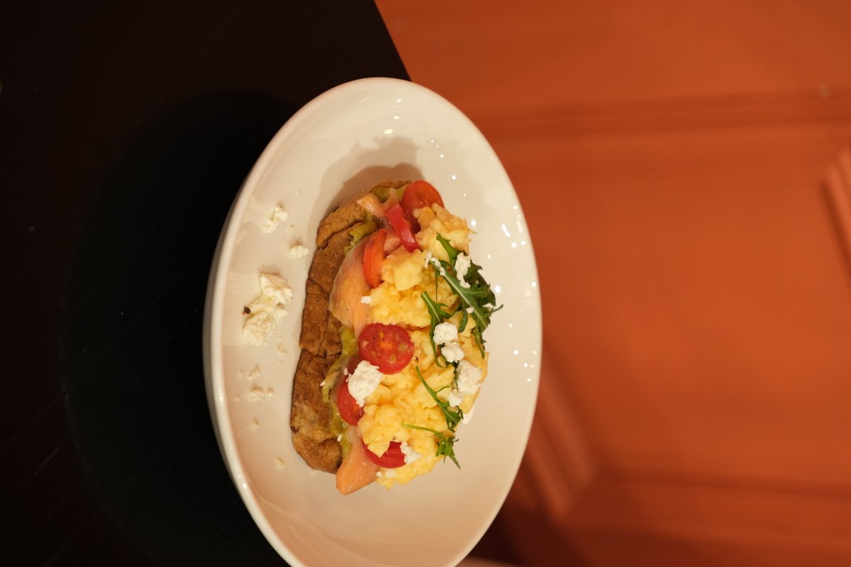 Завтрак со скремблом, хумусом, микс салатом и тартином с лососем копченой