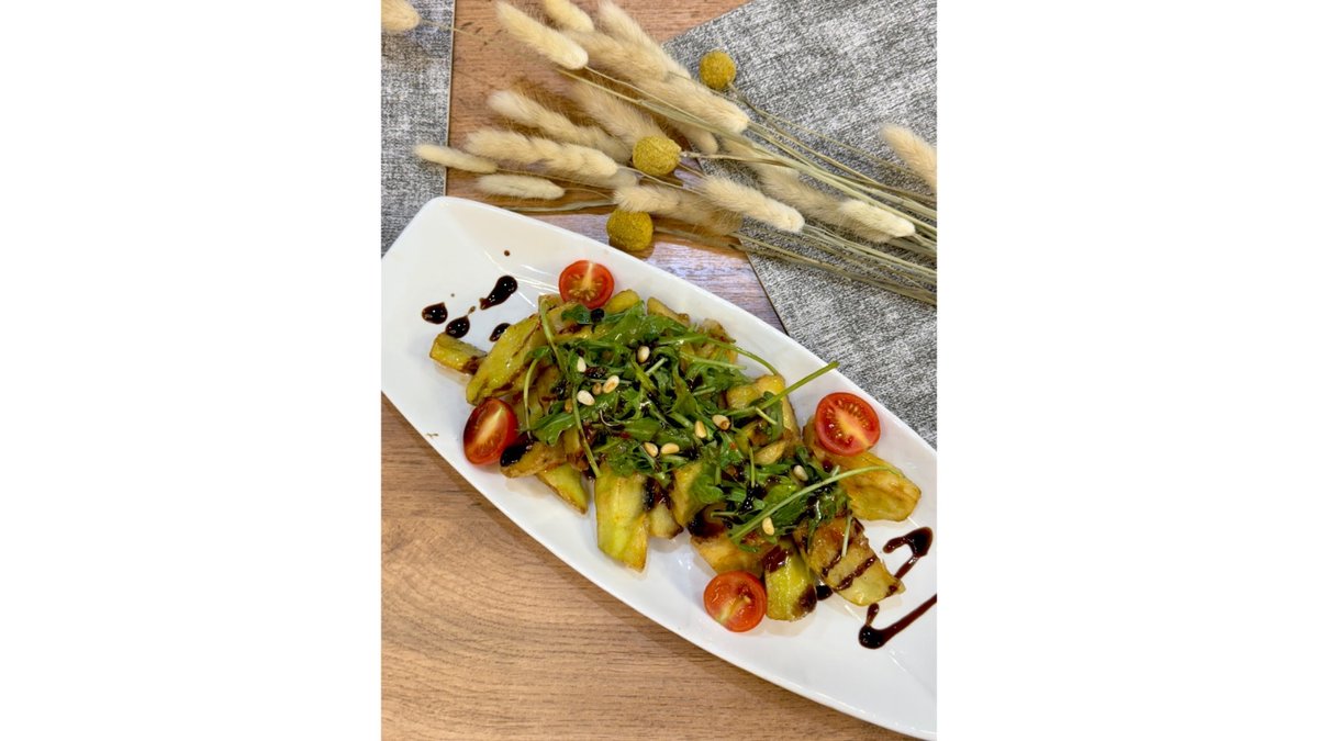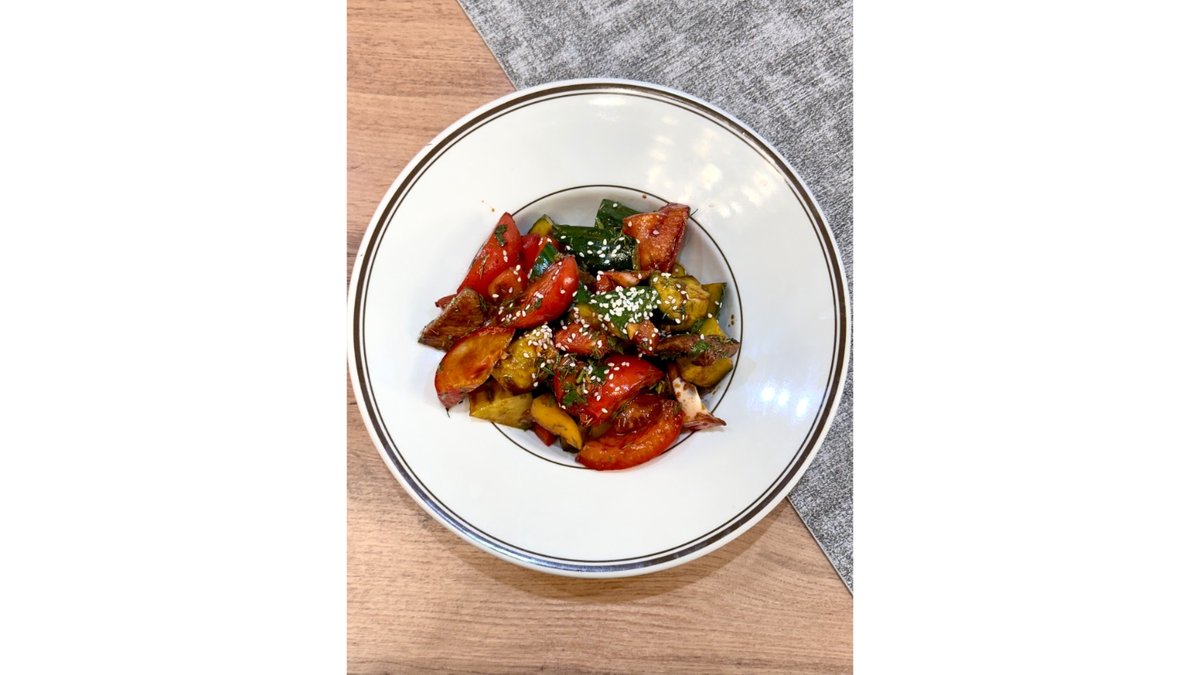 баклажан, помидор, листья микса, кисло-сладкий соус
