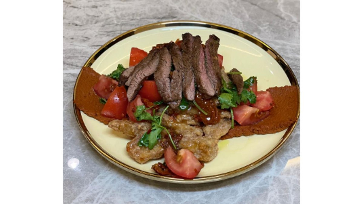 Говядина с хрустящими баклажанами и салат с соусом Мухаммара