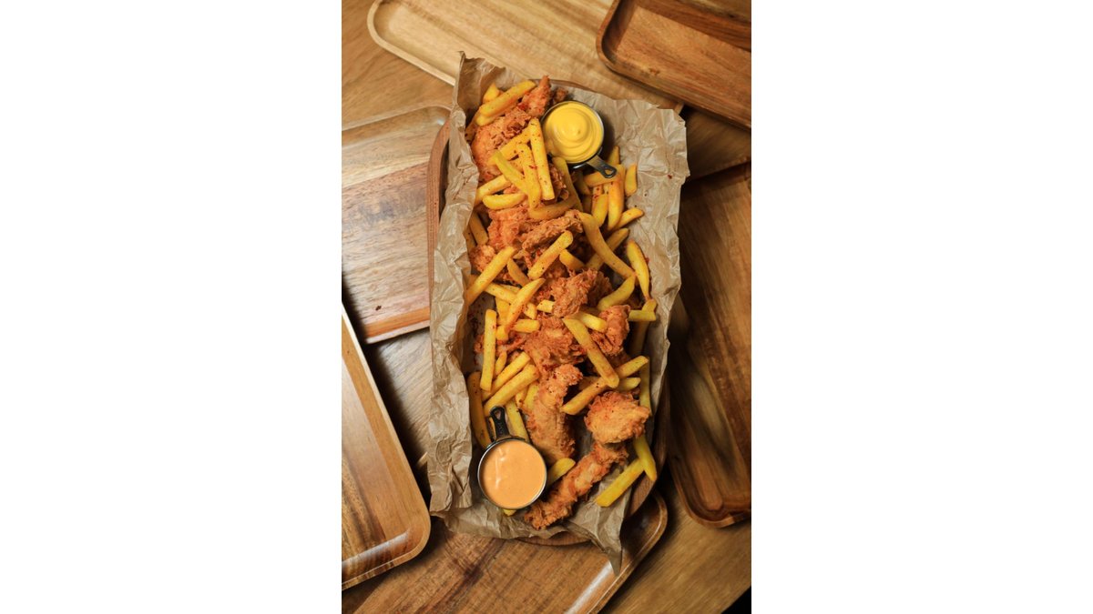 Фри,куриные стрипсы,огурец,сыр,лист салата,помидор,чипсы