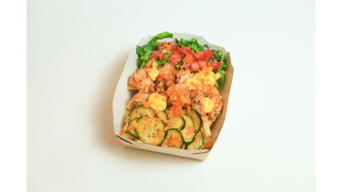 Курица в кляре,помидор,битые огурцы,капуста,фирменый соус,томленый лук