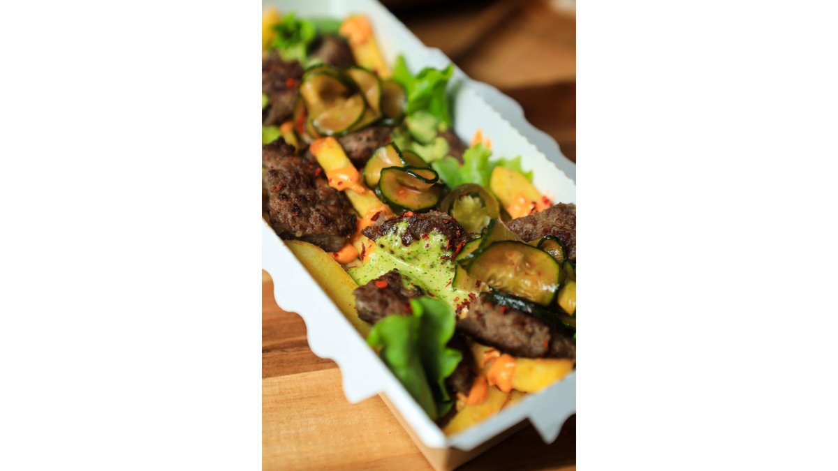Фри,говяжья котлета,маринованые огурцы,халапеньо,микс салата,фирменный соус