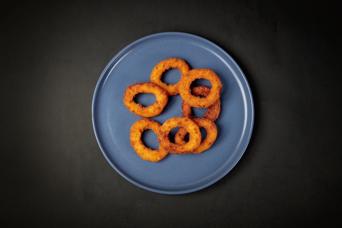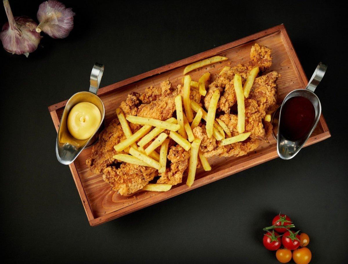 Куриное филе в кляре, фри, соус барбеку, соус сырный