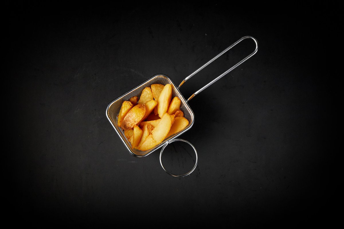 куриное бедро, помидоры, огурец, фри, айсберг, фирменный соус