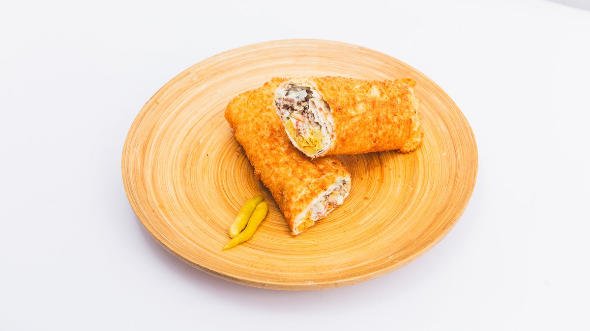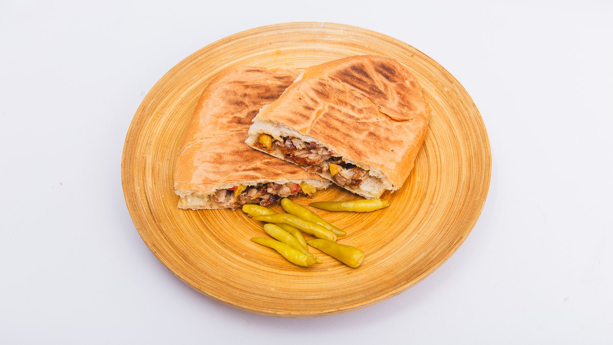 500-550 грамм, состав: лаваш, мясо куриное, соленые огурцы, свежие помидоры, картофель фри, фирменный соус